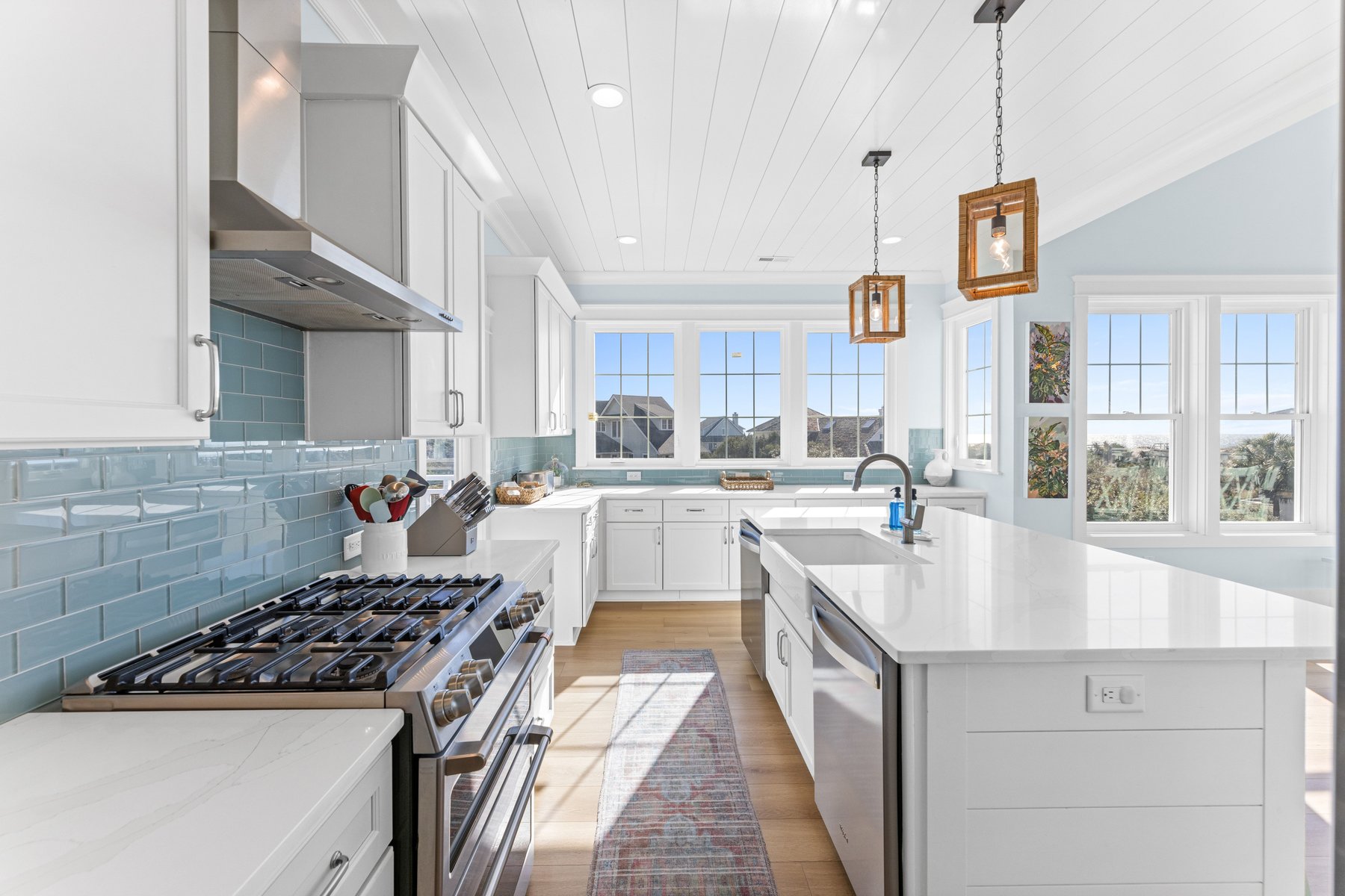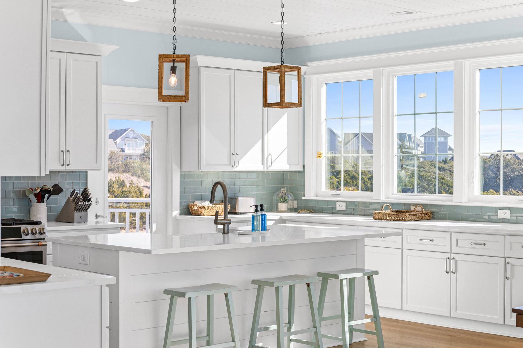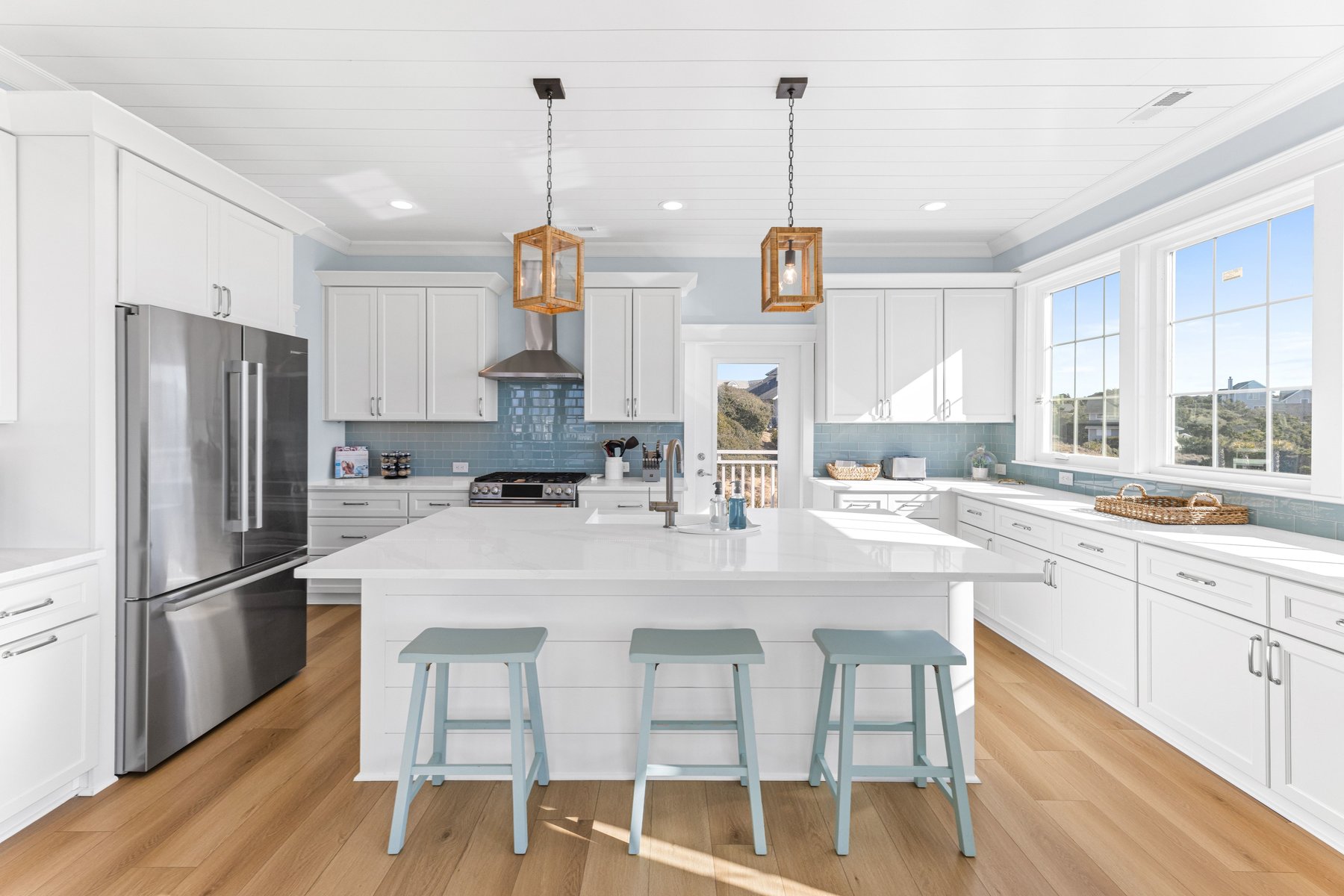 As you walk upstairs, prepare to be in awe of the stunning ocean views. From the grand living area with vaulted ceilings, you will be enticed by the blue waves outside the windows that appear to a few feet away. The living room. offers comfortable but elegant furniture, a mounted flat screen TV, and an ocean front covered porch for outdoor living and al fresco dining. The extra-large and fully equipped gourmet kitchen with plenty of counter space, butler's pantry, stainless steel appliances, double dishwashers, top of line cookware, and fully stocked for multiple chefs to work together. Bar stool seating for four at the kitchen island, and an XL dining table with seating for 8 guests provides you will have plenty of space and everything you need to create great memories with family and friends while enjoying meals on vacation. A convenient deck for grilling and coffee or wine drinking is located off the kitchen. There is a beach decor fun half bath for your convenience on this main level as well.