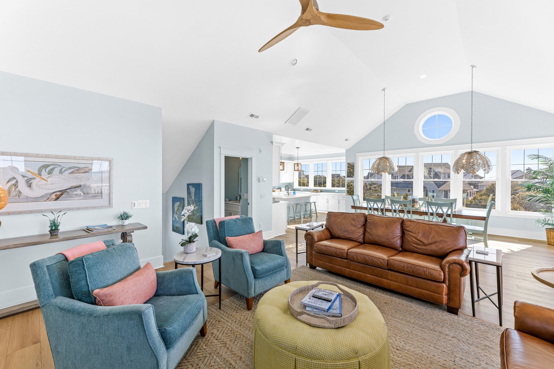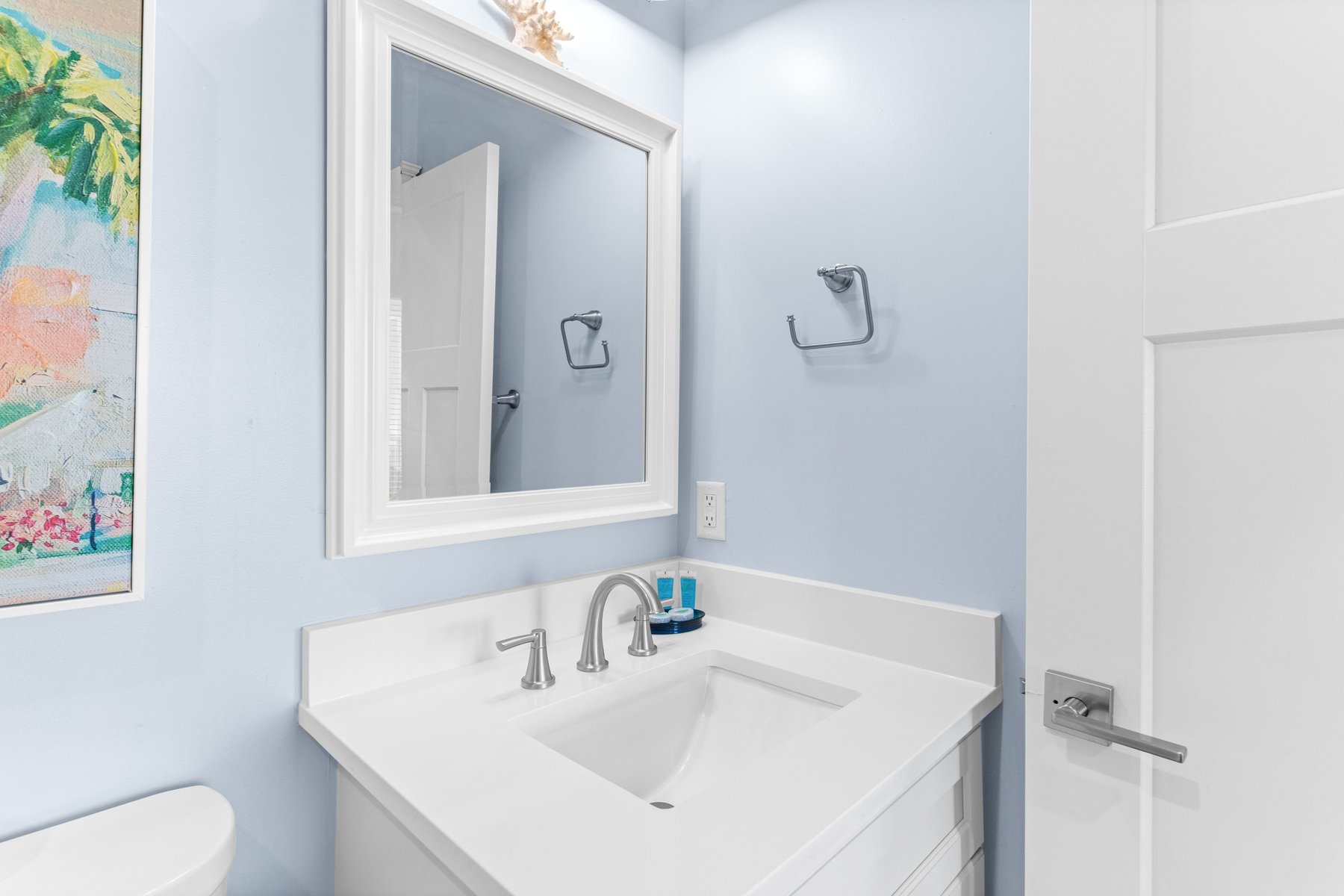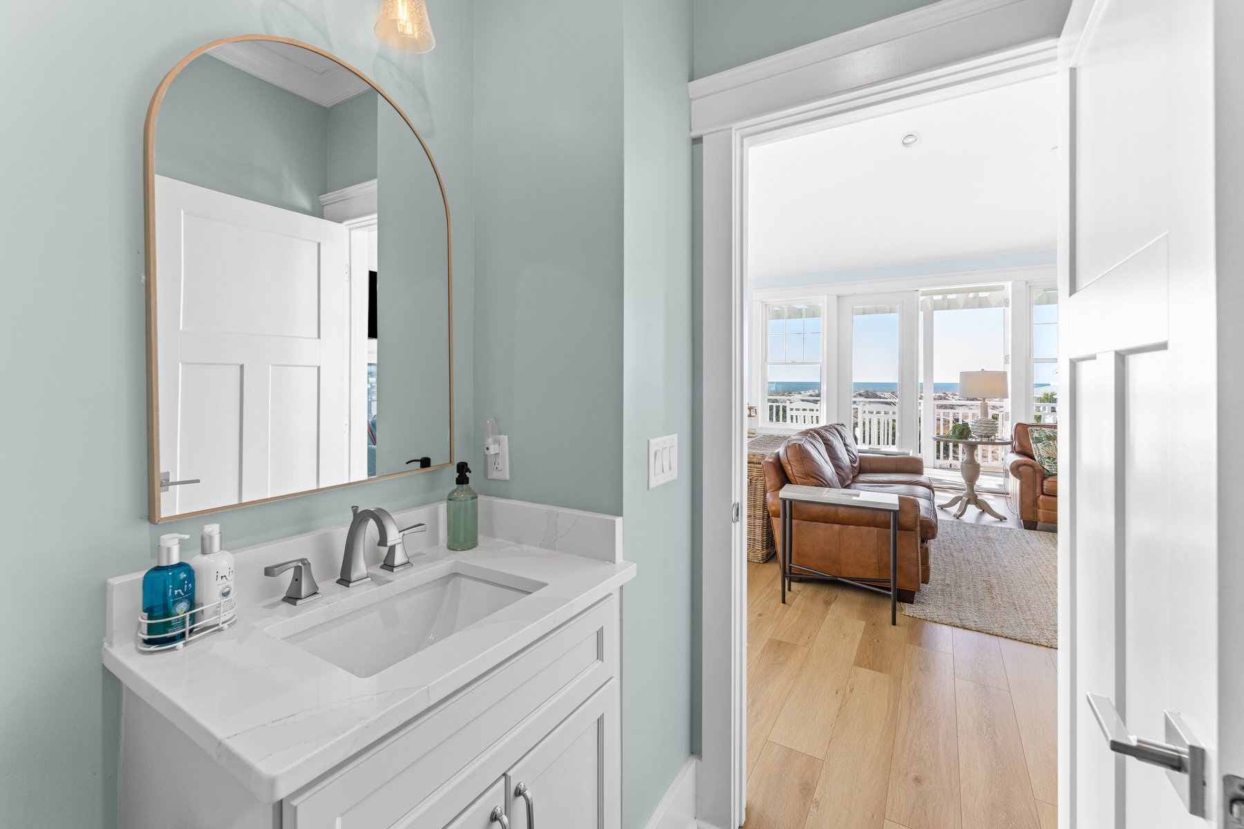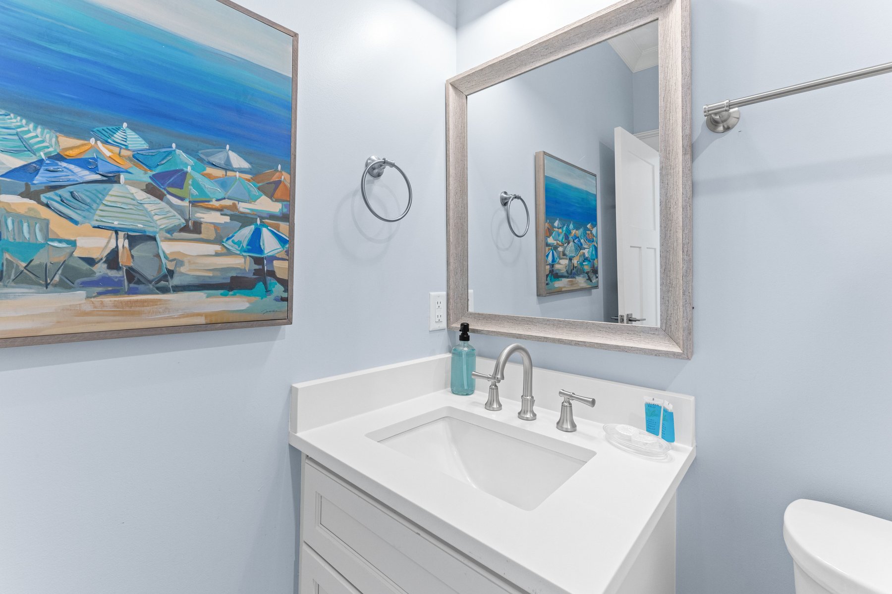 As you walk upstairs, prepare to be in awe of the stunning ocean views. From the grand living area with vaulted ceilings, you will be enticed by the blue waves outside the windows that appear to a few feet away. The living room. offers comfortable but elegant furniture, a mounted flat screen TV, and an ocean front covered porch for outdoor living and al fresco dining. The extra-large and fully equipped gourmet kitchen with plenty of counter space, butler's pantry, stainless steel appliances, double dishwashers, top of line cookware, and fully stocked for multiple chefs to work together. Bar stool seating for four at the kitchen island, and an XL dining table with seating for 8 guests provides you will have plenty of space and everything you need to create great memories with family and friends while enjoying meals on vacation. A convenient deck for grilling and coffee or wine drinking is located off the kitchen. There is a beach decor fun half bath for your convenience on this main level as well.