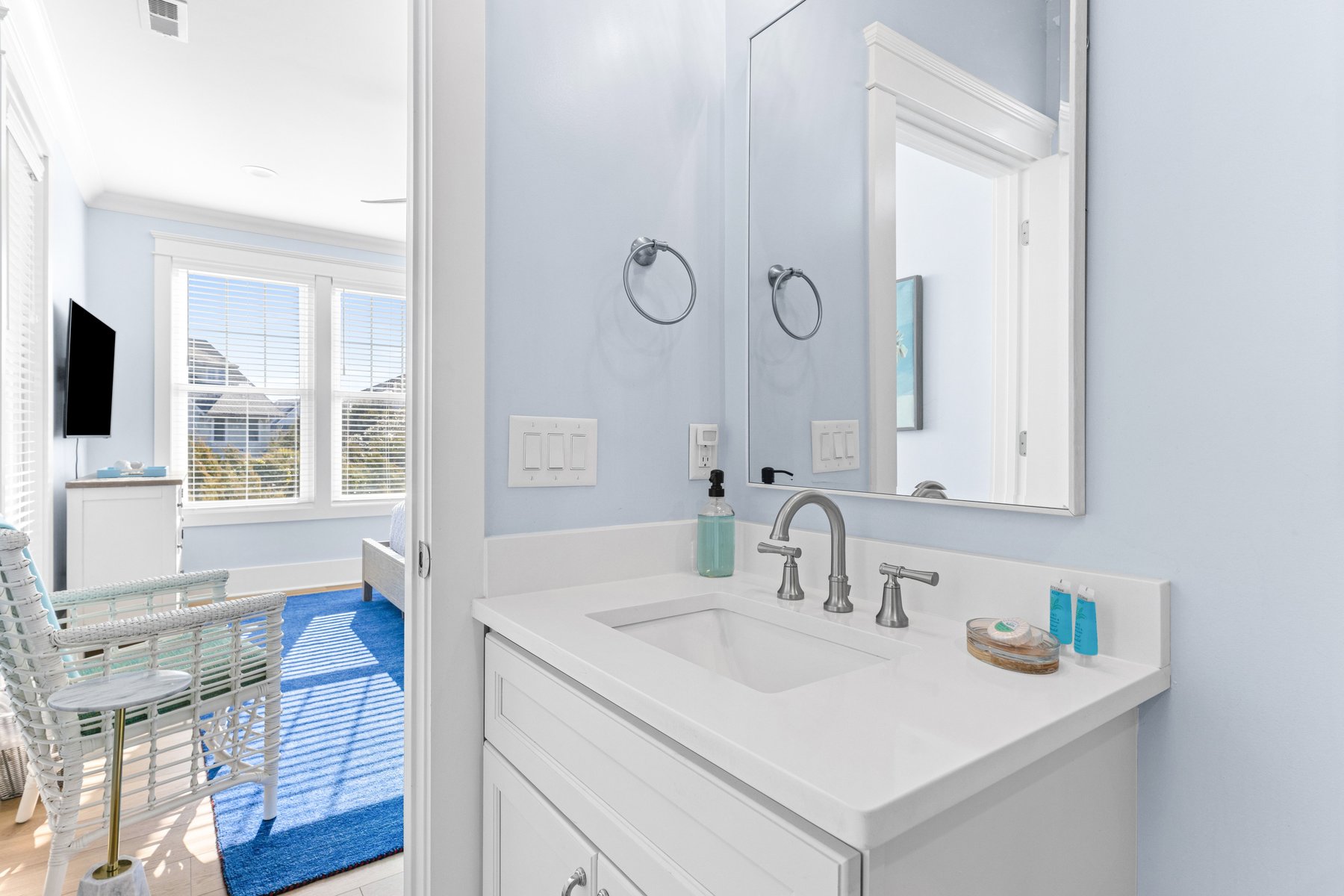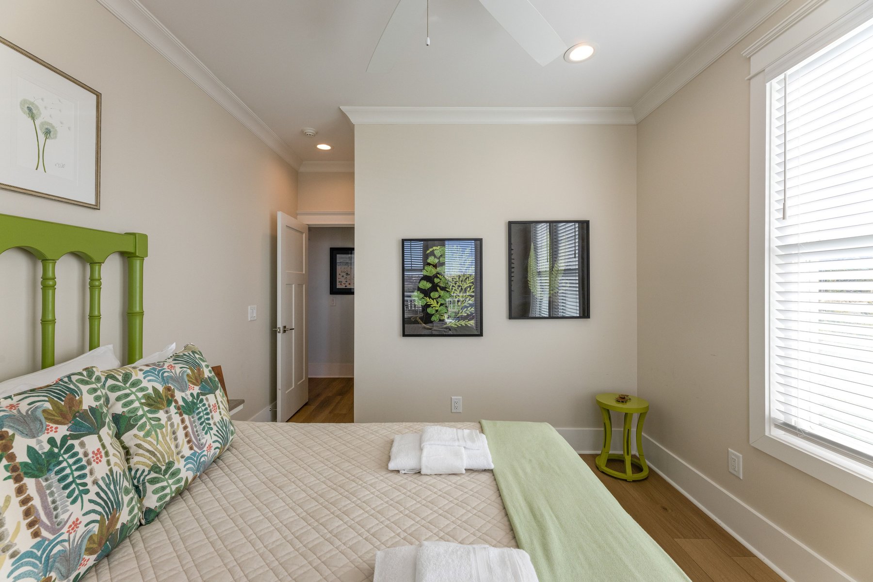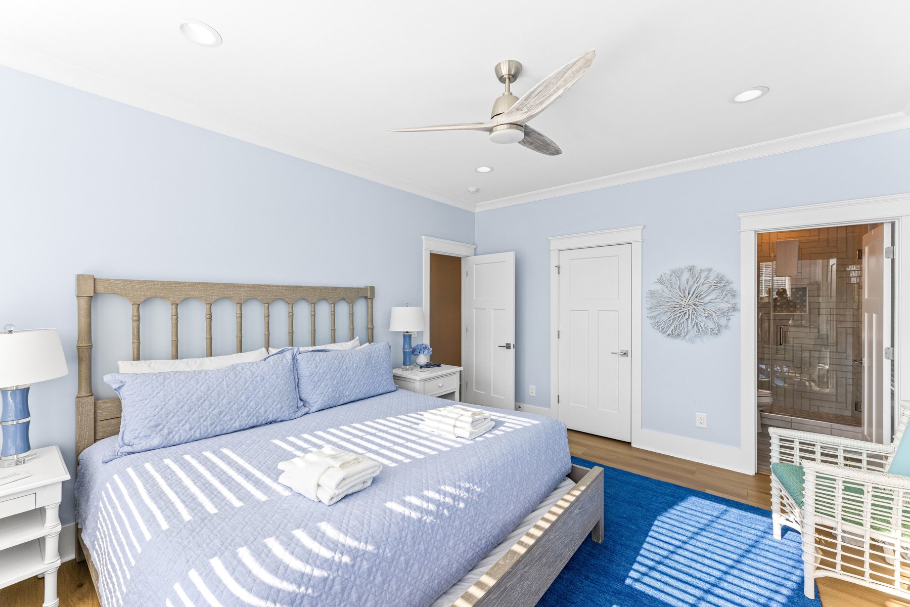 As you enter you will fall in love with the gorgeous coastal décor and be wowed as you wander throughout the whole house. The beautiful hardwood floors and distinctive unique décor offer a designer touch not often found in a rental home. Enter through the castle like oak front door, and you will find a welcoming foyer which also serves as a library and a great spot for conversation, game playing or a quiet read. On this level you will find four sunny bedrooms including two master suites. To the left, the King Owner's Suite occupies the entire end of the house. XL windows on both sides flood the space with sunshine and has one of the prettiest bathrooms on the island with its pampering freestanding tub, and luxe marble shower. Another bright King corner suite not only indulges with an ensuite spa bath but also delights with a private covered porch of its own. Down the hall is a sunlit Queen with its own ensuite. Next to it, a corner Queen bedroom providing access to the front porch and conveniently utilizes the full bath just outside its door. A laundry room completes this floor. The kids will fall in love with the ground level kid suite/rec room. This area, with its own large full bath, is furnished with two bunks and is the perfect place for lounging, game-playing, and movie-watching.