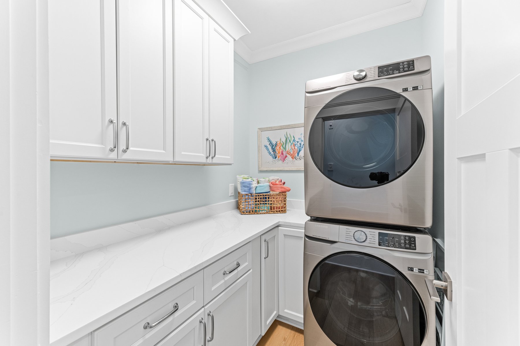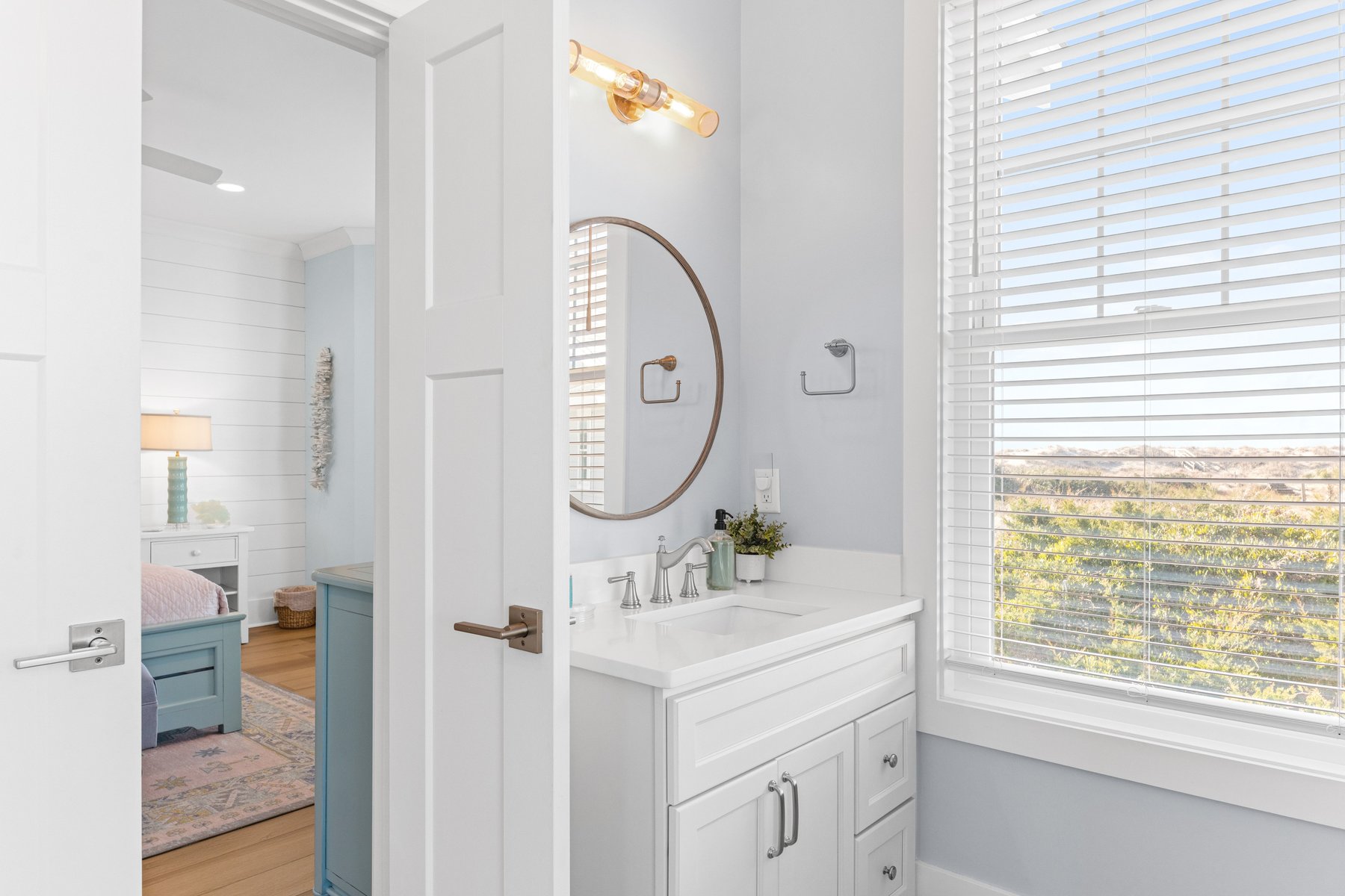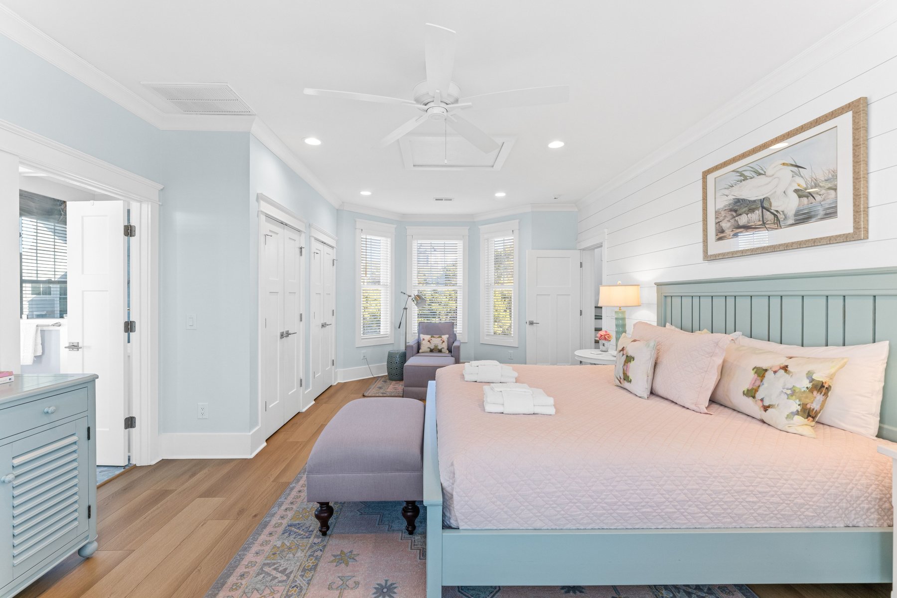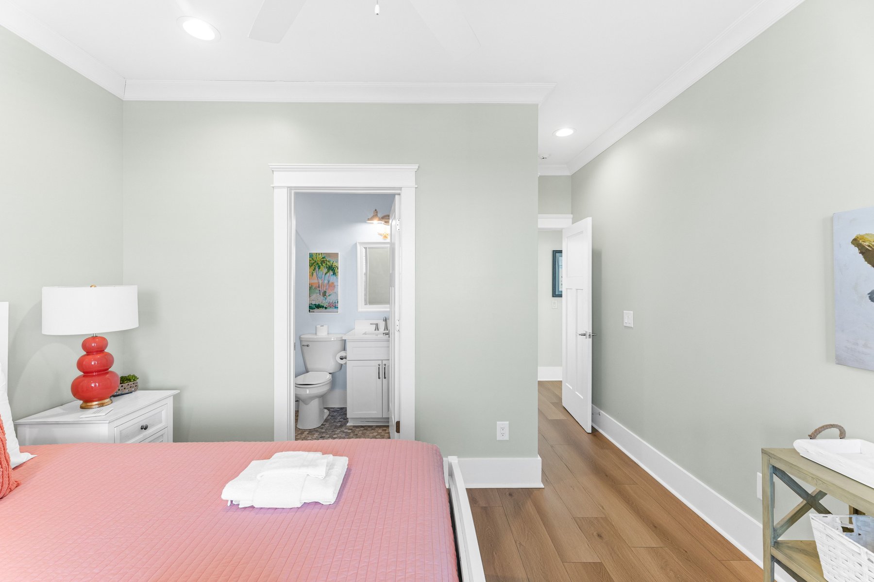 As you enter you will fall in love with the gorgeous coastal décor and be wowed as you wander throughout the whole house. The beautiful hardwood floors and distinctive unique décor offer a designer touch not often found in a rental home. Enter through the castle like oak front door, and you will find a welcoming foyer which also serves as a library and a great spot for conversation, game playing or a quiet read. On this level you will find four sunny bedrooms including two master suites. To the left, the King Owner's Suite occupies the entire end of the house. XL windows on both sides flood the space with sunshine and has one of the prettiest bathrooms on the island with its pampering freestanding tub, and luxe marble shower. Another bright King corner suite not only indulges with an ensuite spa bath but also delights with a private covered porch of its own. Down the hall is a sunlit Queen with its own ensuite. Next to it, a corner Queen bedroom providing access to the front porch and conveniently utilizes the full bath just outside its door. A laundry room completes this floor. The kids will fall in love with the ground level kid suite/rec room. This area, with its own large full bath, is furnished with two bunks and is the perfect place for lounging, game-playing, and movie-watching.