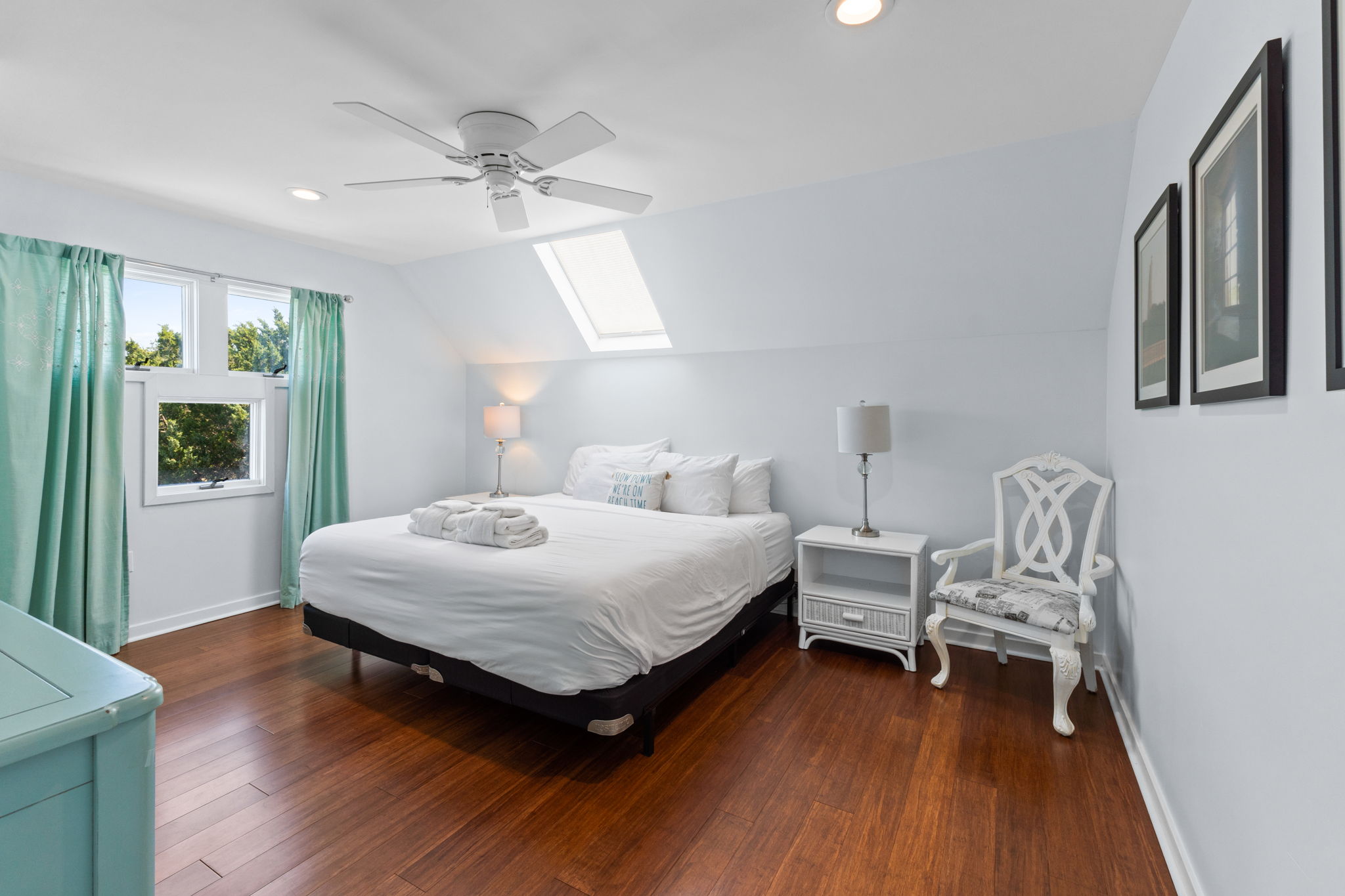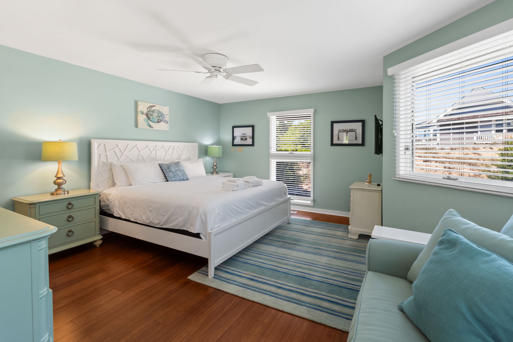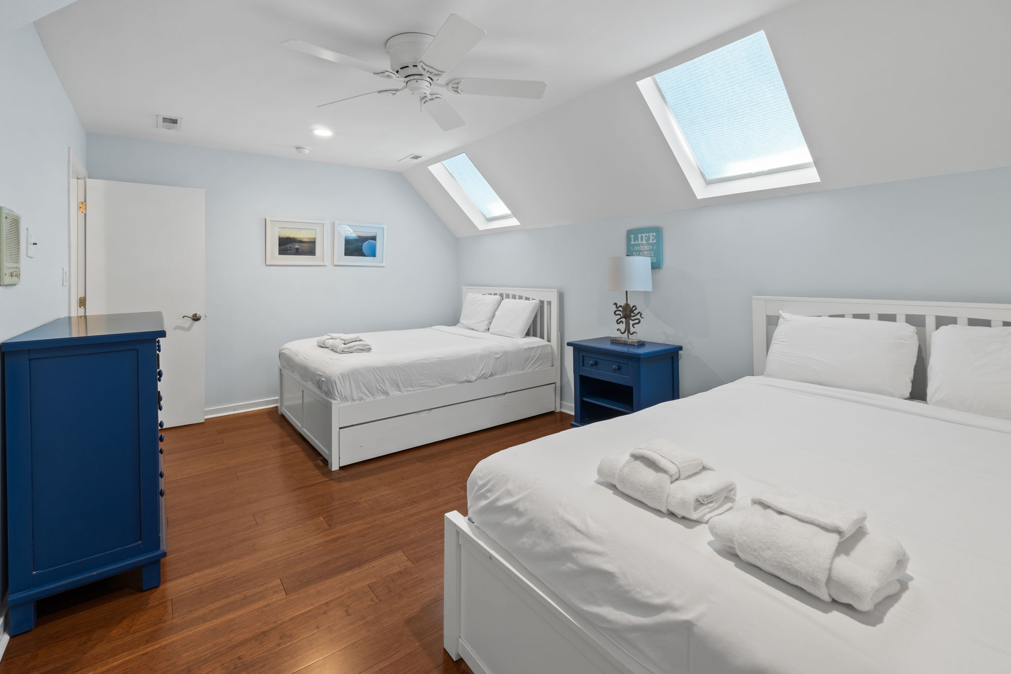 The home features 5 bedrooms and 4 full and 1 half bathroom, comfortably sleeping 14 guests. Three of the bedrooms are equipped with king-sized beds, including two king master en-suites and a king guest room. The fourth bedroom features a queen-sized bed, while the fifth bedroom hosts two queen beds with two trundles. An upper floor sitting room includes a sleeper sofa.