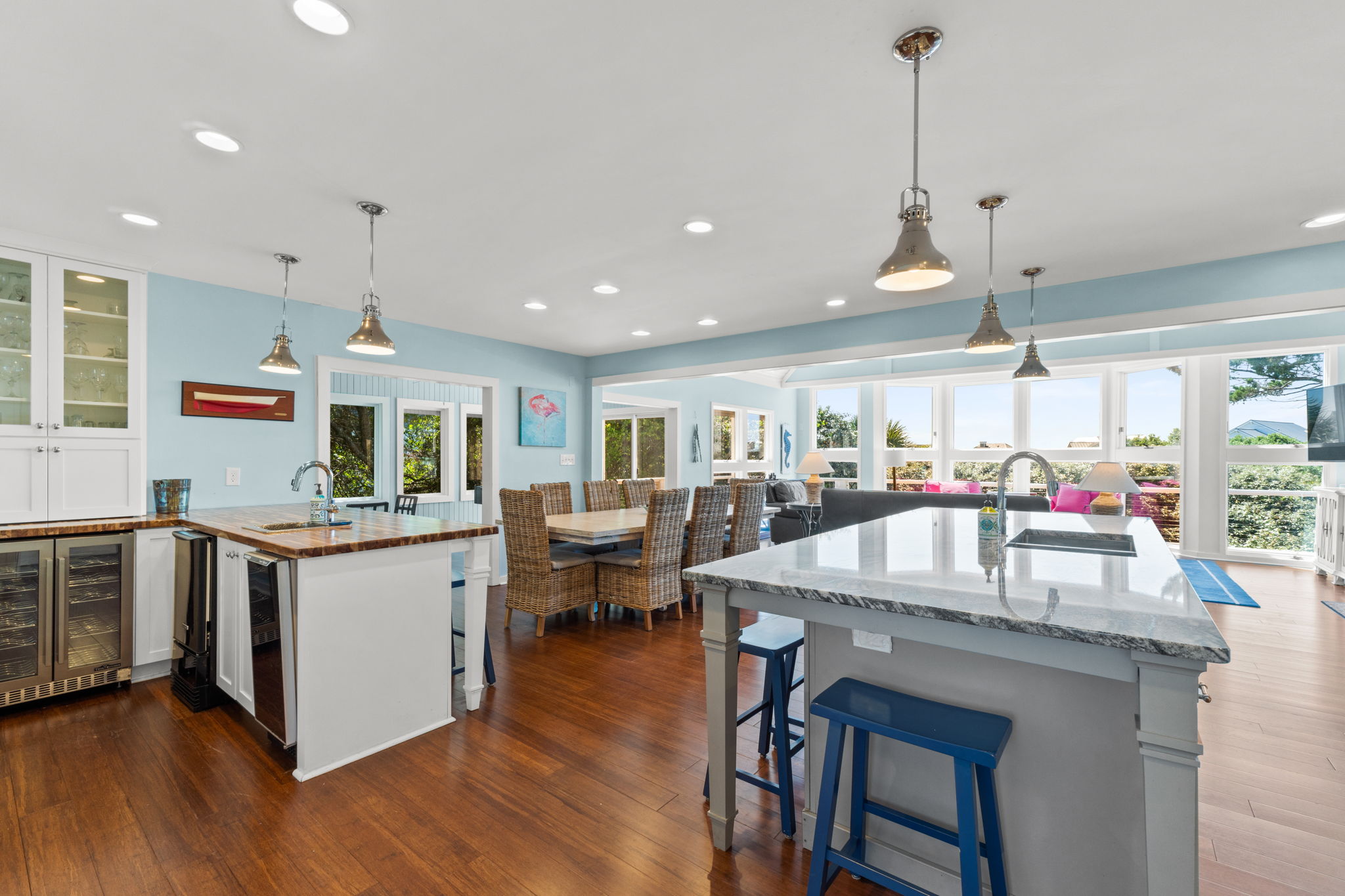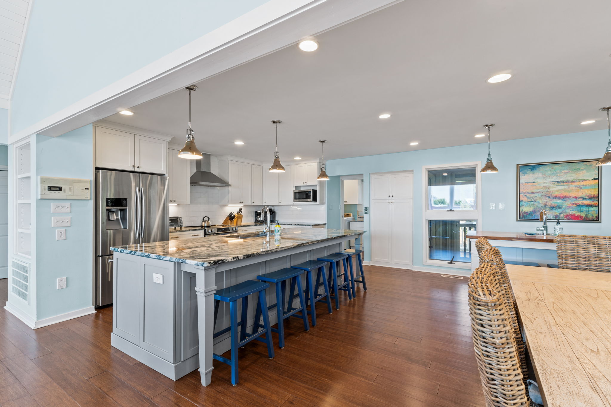 The gourmet kitchen could win the Best on Island Award with the attention to detail one rarely finds in a vacation home. Fully stocked - just bring your food - you will find the chef in your group will be inspired to create great meals. An XL center island with beautiful countertops for meal prep and entertainment, high end stainless-steel appliances, 2 full size refrigerators, separate bar area with a wine cooler and ice maker. Right off the main kitchen, this home also has a unique outdoor kitchen with grill room and another XL table for “outdoor” dining rain or shine – another place that sets the scene for great entertaining and family memories.
