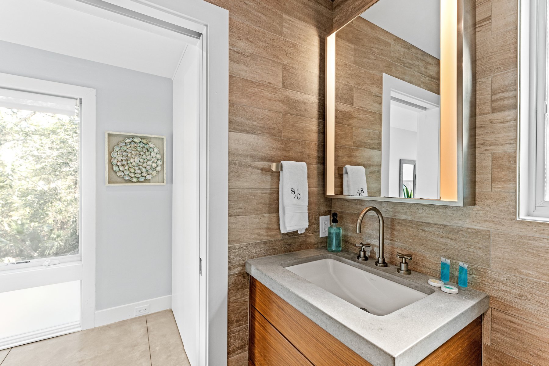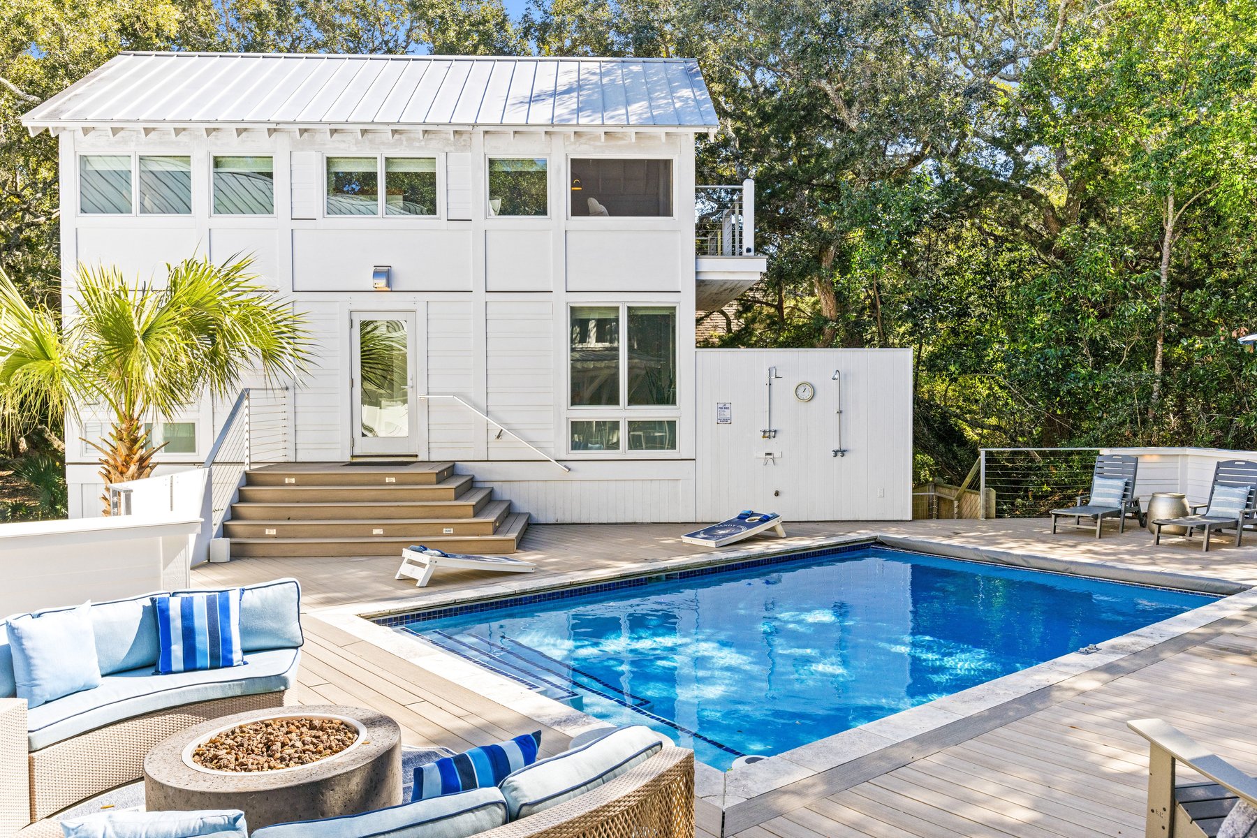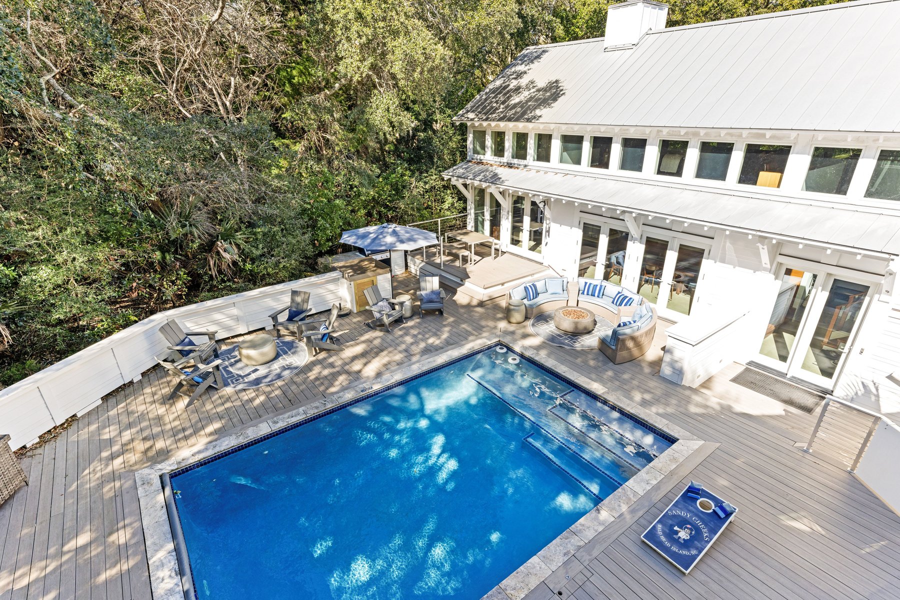 Welcome to your dream vacation home on Bald Head Island. Just a few short blocks to South Beach, ''Sandy Cheeks" offers the perfect combination of sophistication and comfort surrounded by the natural beauty of the Maritime Forest. The opportunity for friends and family to relax privately in this home is unparalleled. With a bedroom/bathroom suite and a living area on each floor of the main house, everyone can enjoy their own space. Invite more guests without hesitation and hand them the keys to the guest house. Take a dip in the saltwater chlorinated pool and relax on the newly renovated deck.