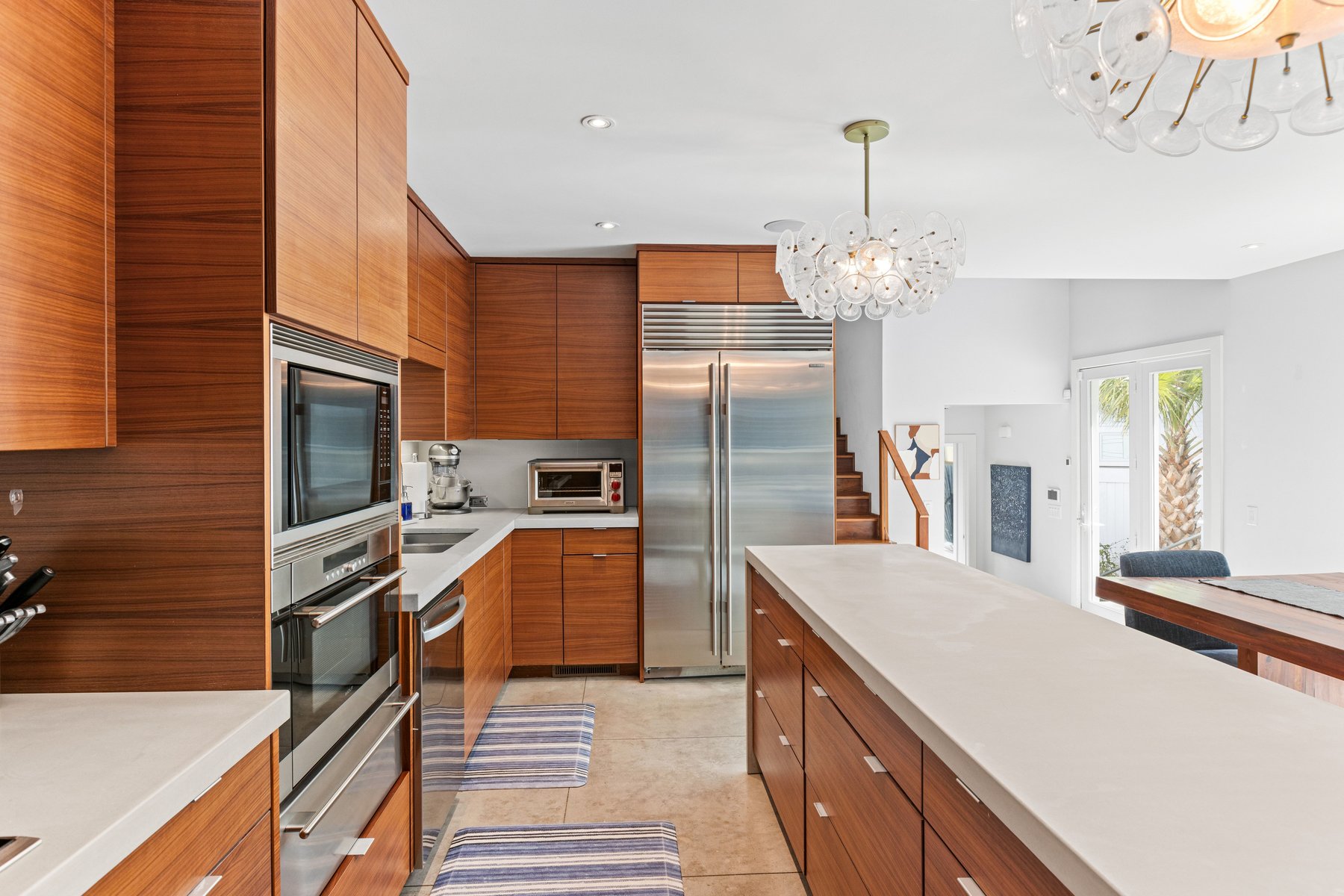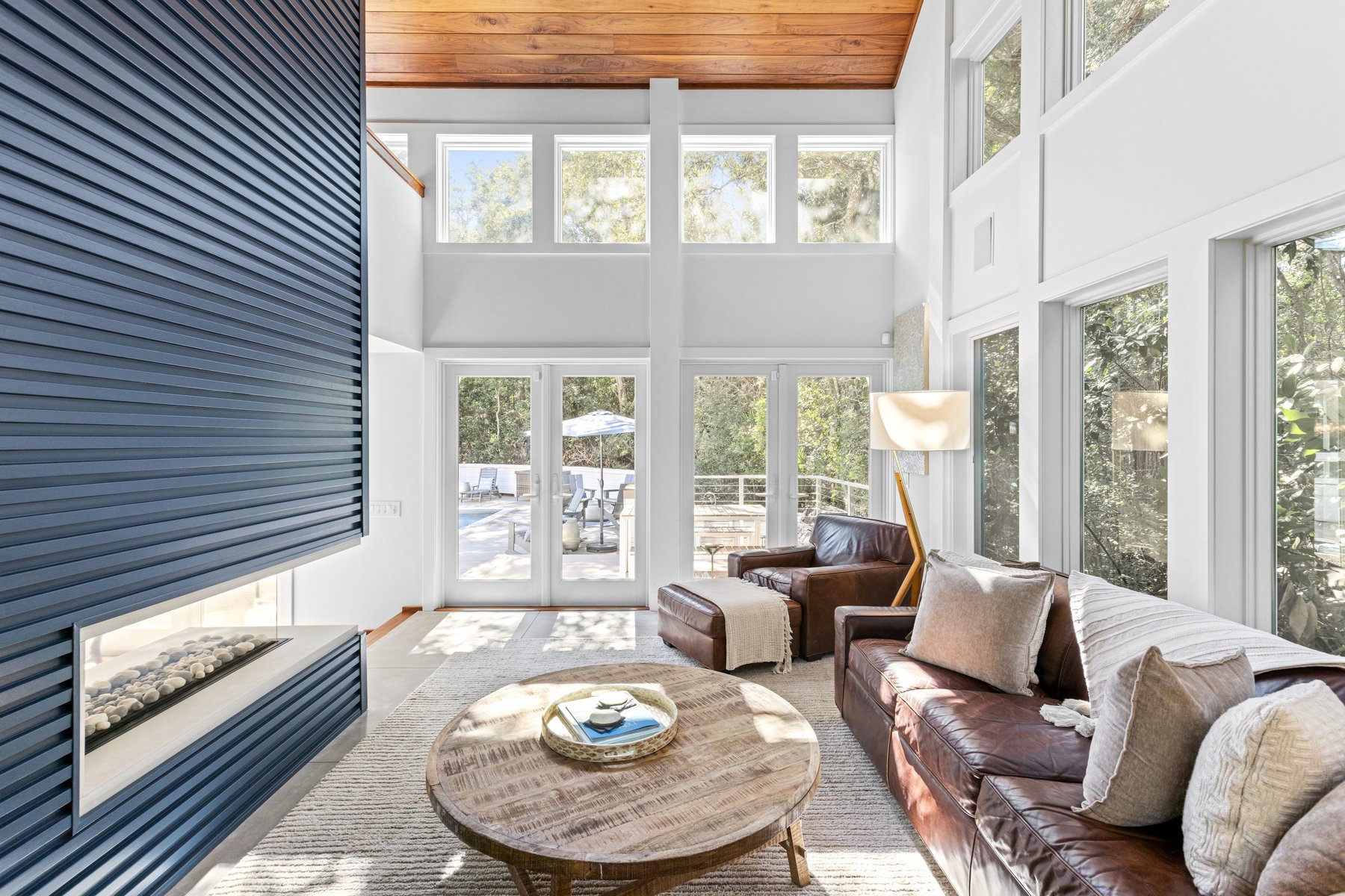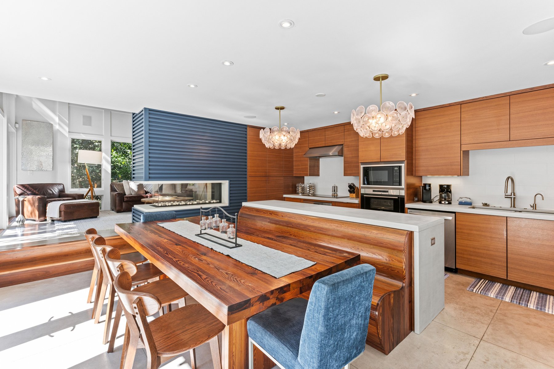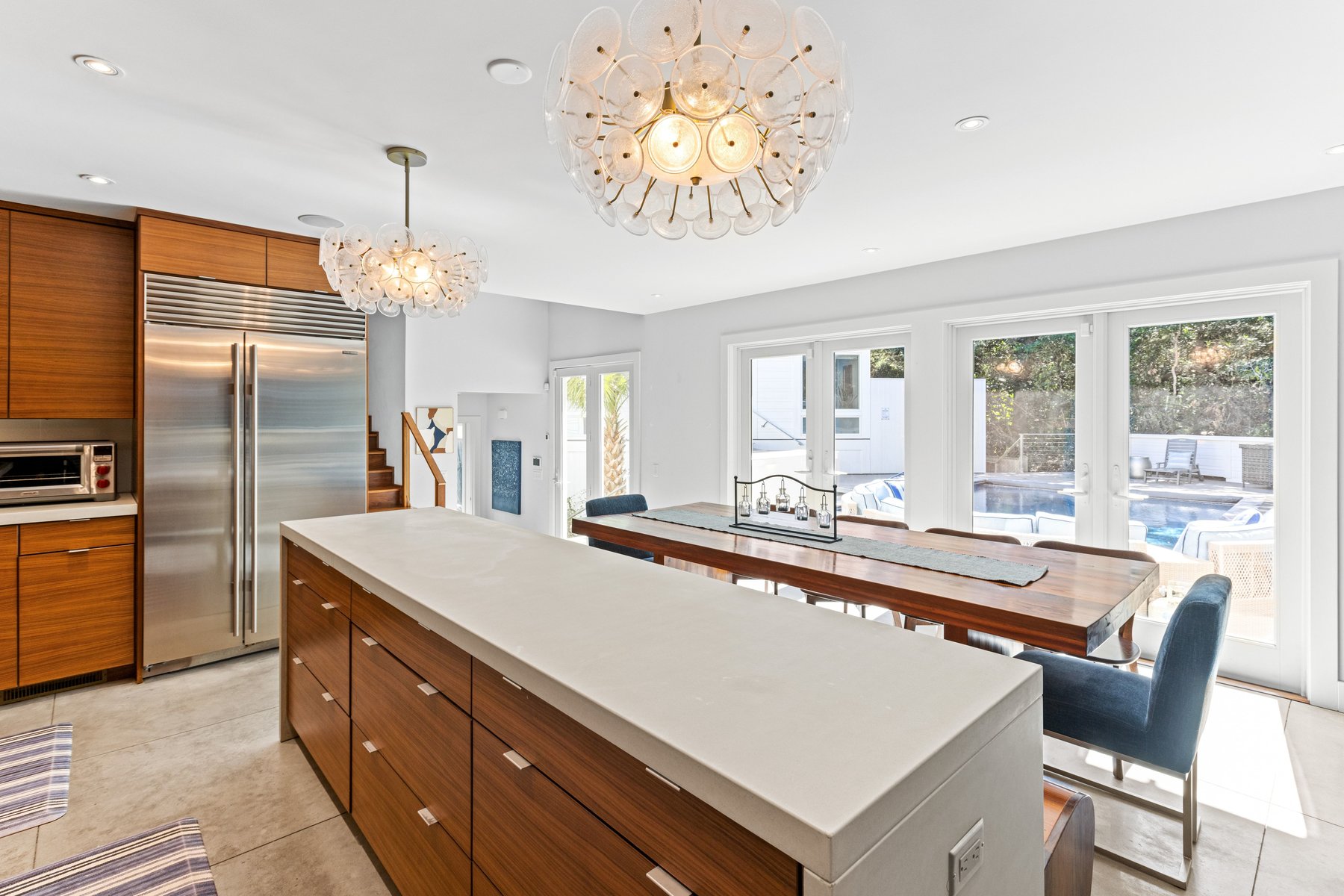 The main house offers an open floor plan with a stunning living room with soaring ceilings, a generous dining area and a XL kitchen all lit up by the sun streaming in from the floor to ceiling windows that allows you to savor the pool and outdoor living area. The chef's kitchen boasts plenty of counter space, stainless steel oversized appliances, butler pantry, wine and coffee bar and a breakfast counter that seats 6.