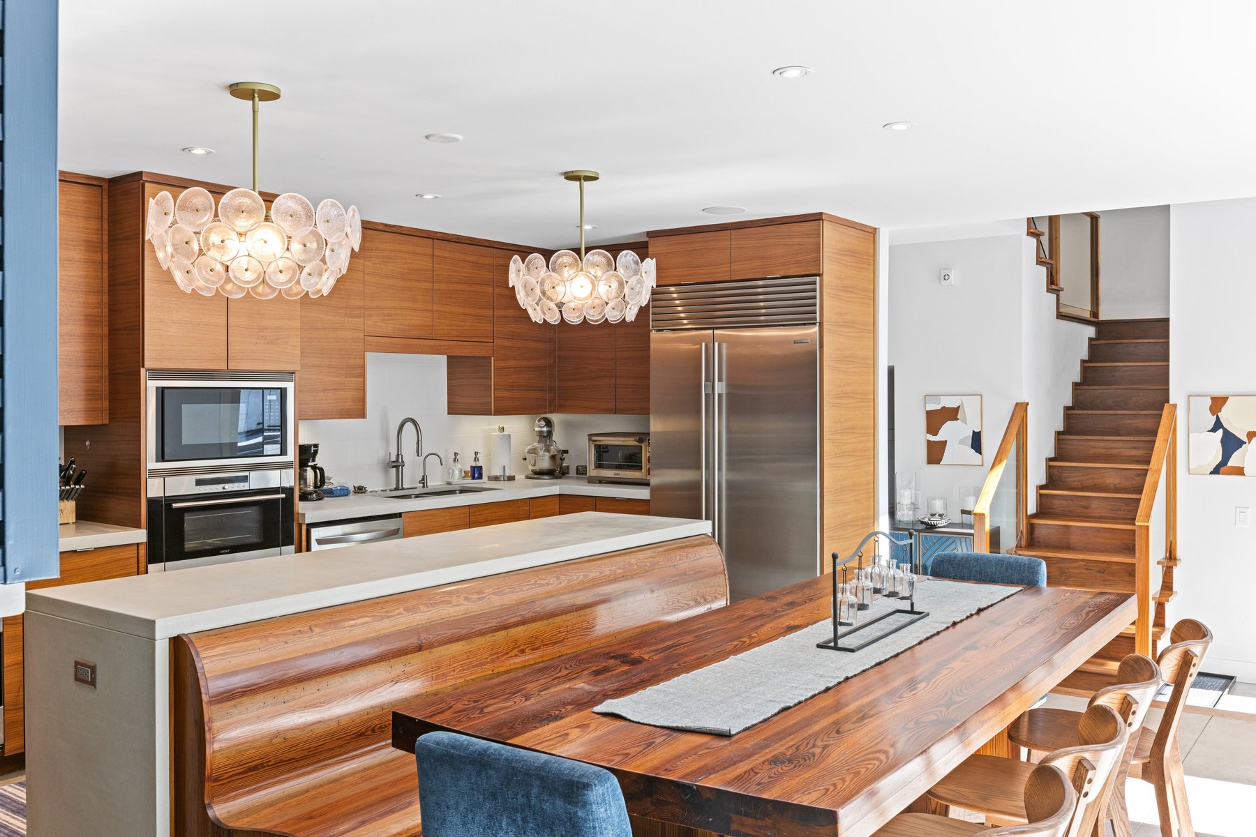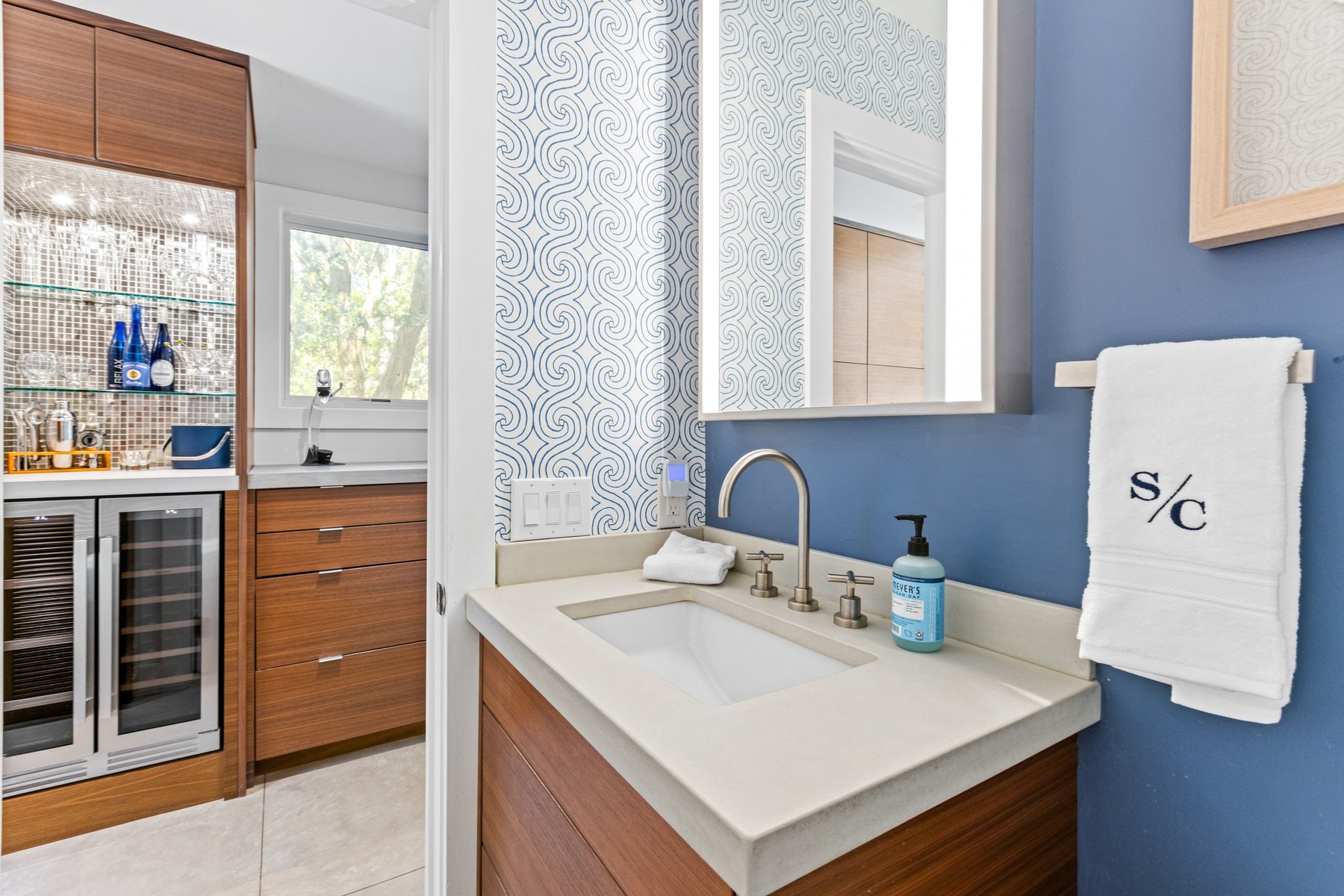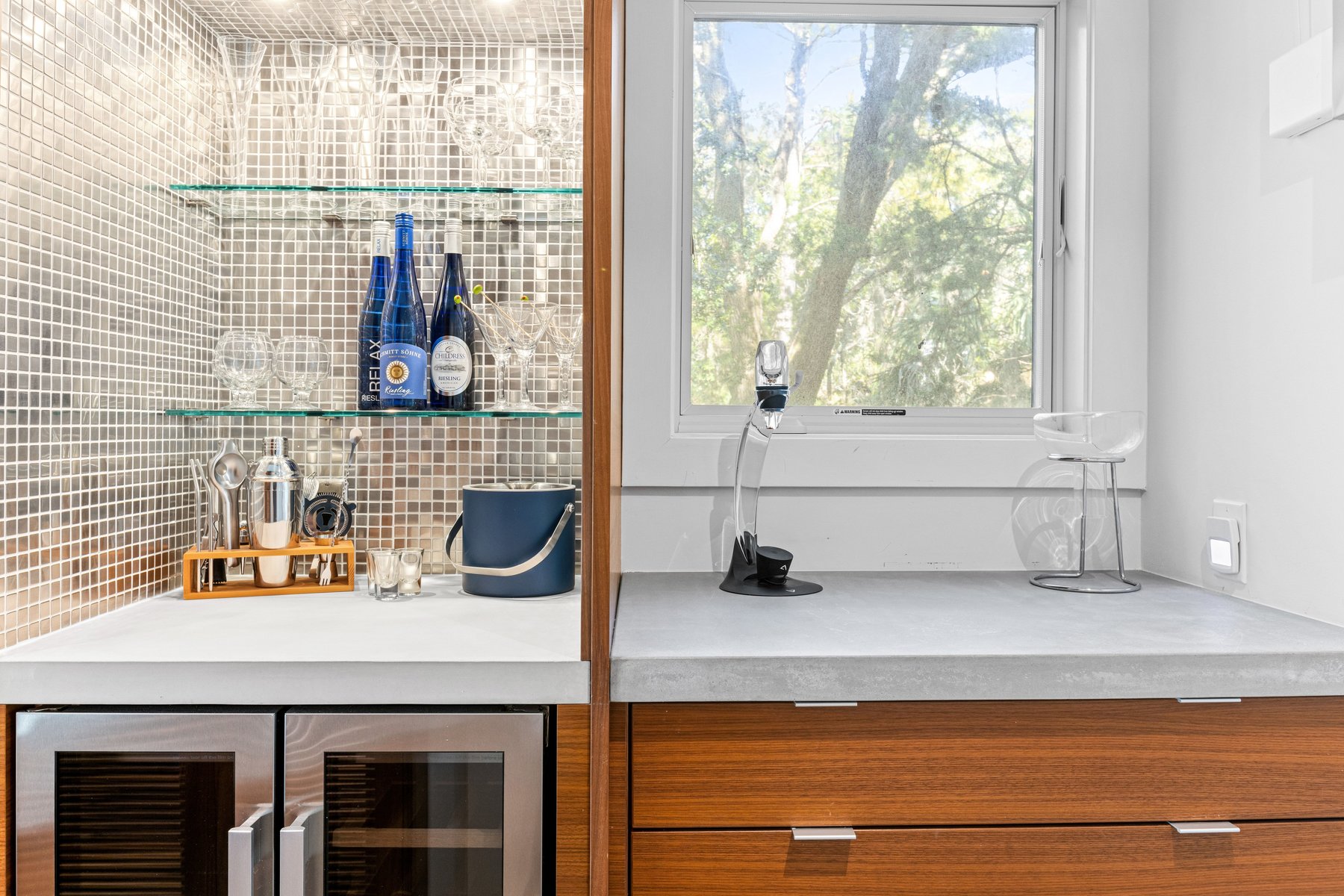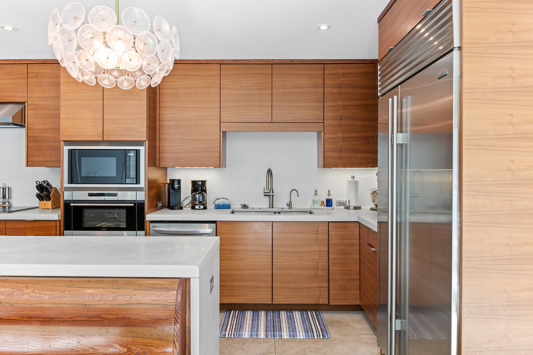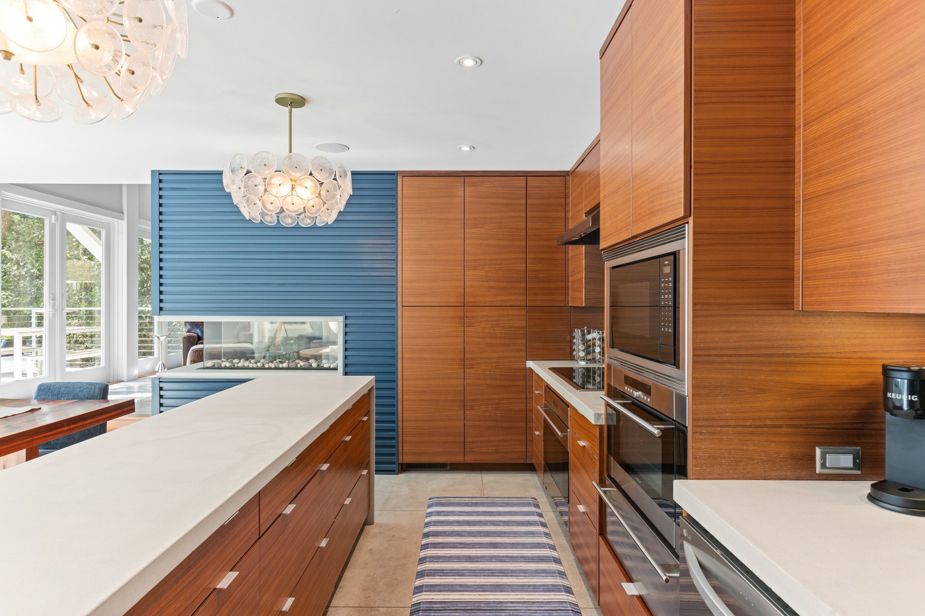 The main house offers an open floor plan with a stunning living room with soaring ceilings, a generous dining area and a XL kitchen all lit up by the sun streaming in from the floor to ceiling windows that allows you to savor the pool and outdoor living area. The chef's kitchen boasts plenty of counter space, stainless steel oversized appliances, butler pantry, wine and coffee bar and a breakfast counter that seats 6.