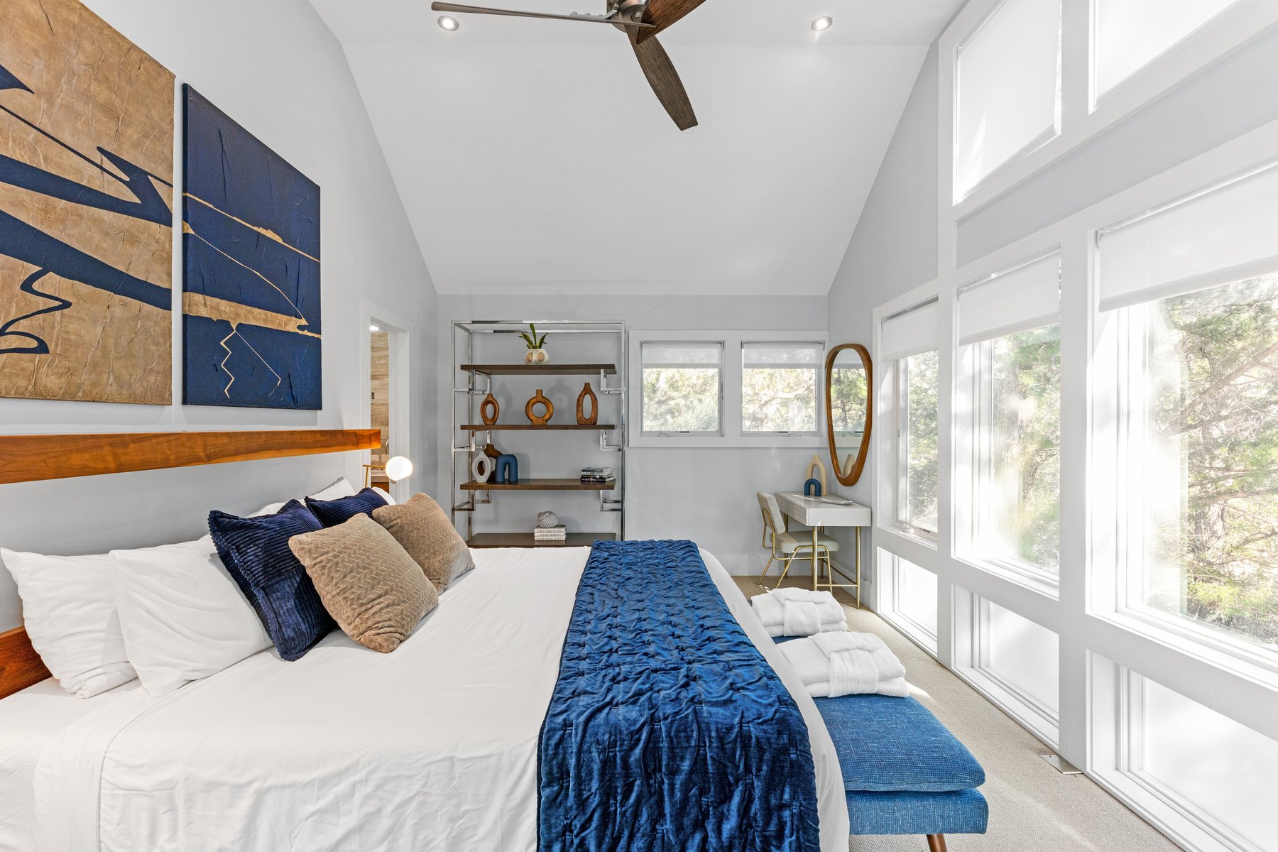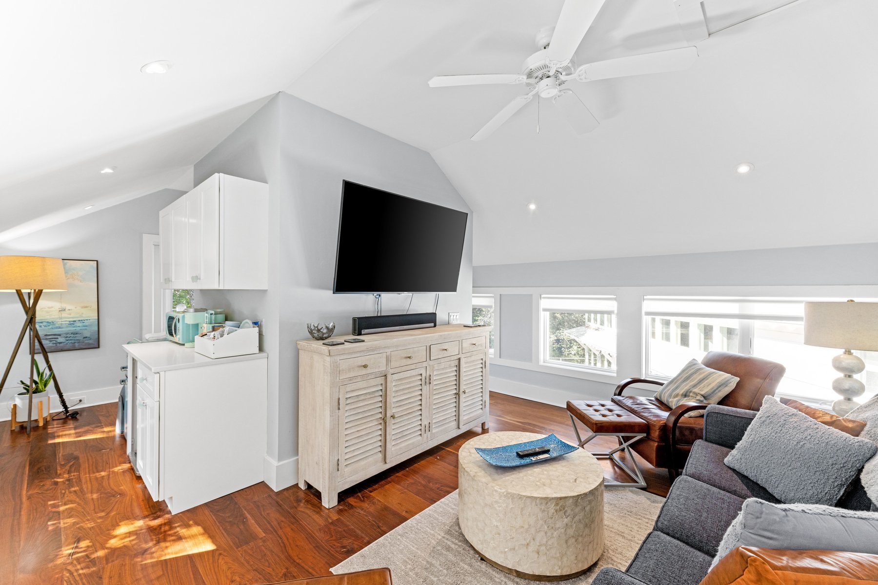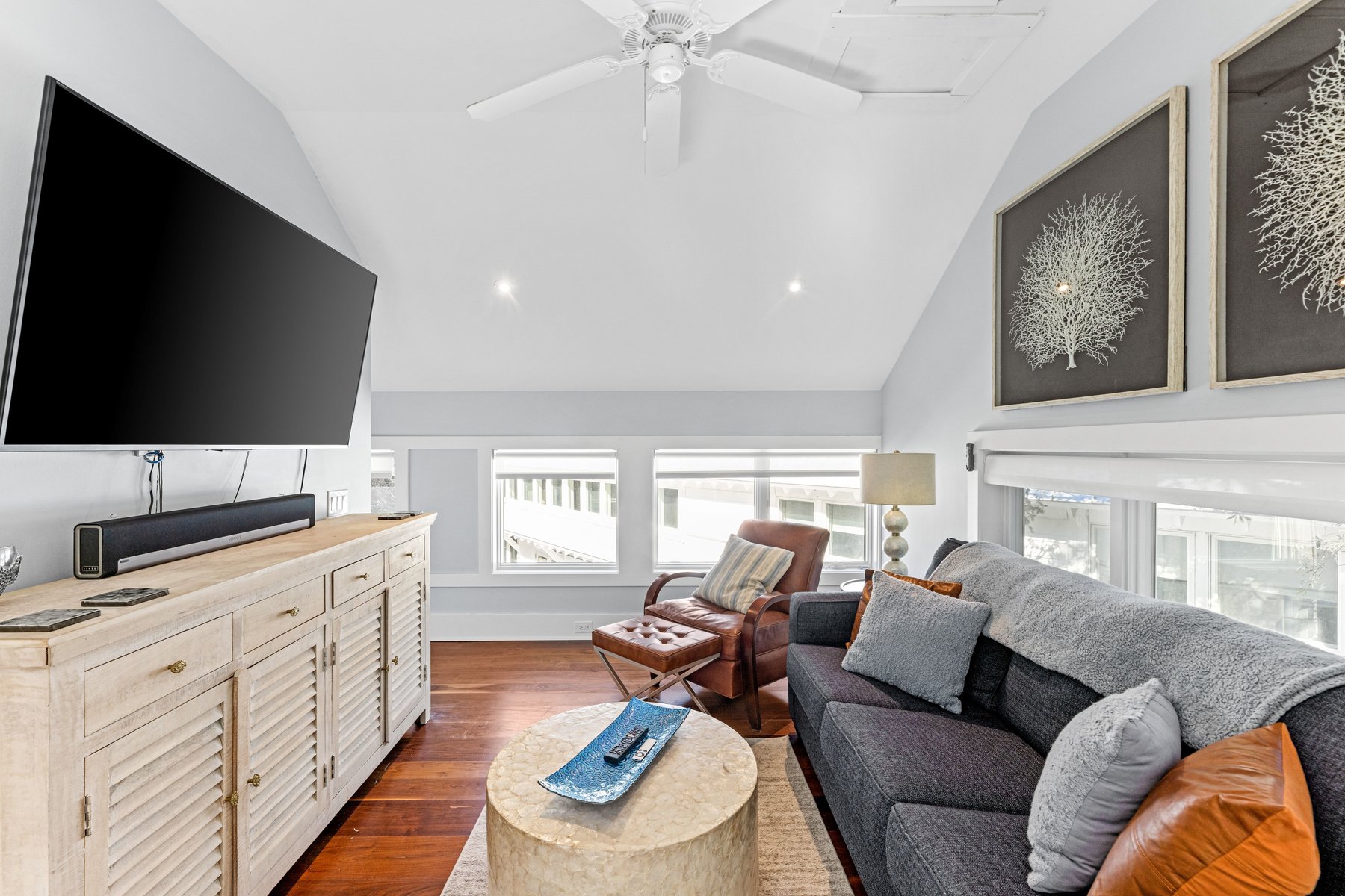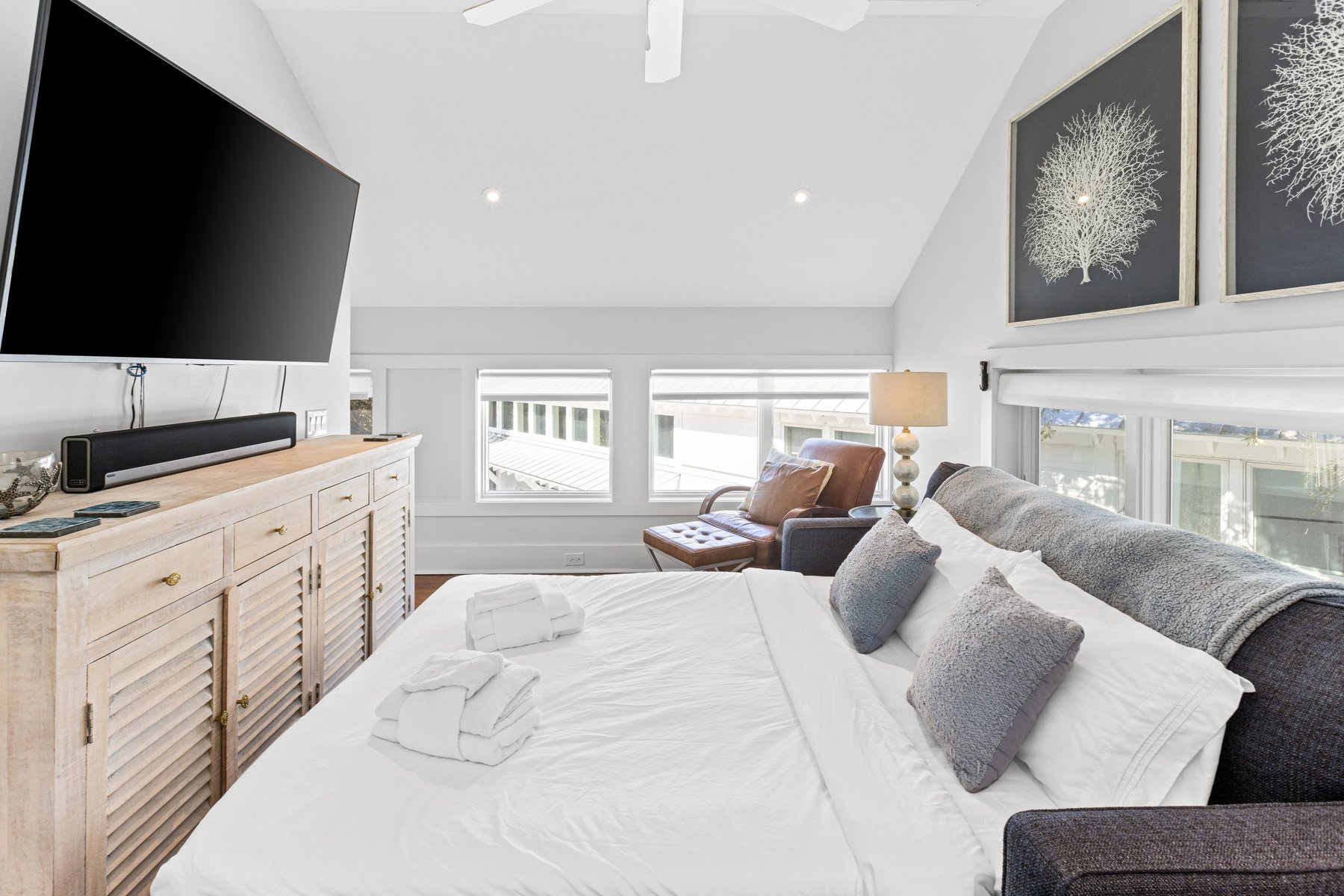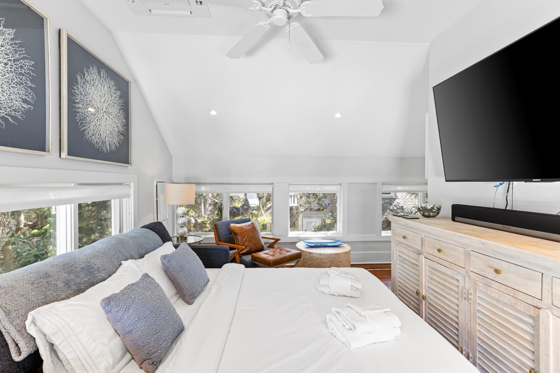 The upper floor of the main house provides an oversize sectional and offers plenty of seating for conversation, movie-watching, or game-playing, and large screen tv. If you must work from home while on vacation, we make it easier with ample desks and office space. Two private suites in the main house have king beds and indulgent spa like baths.