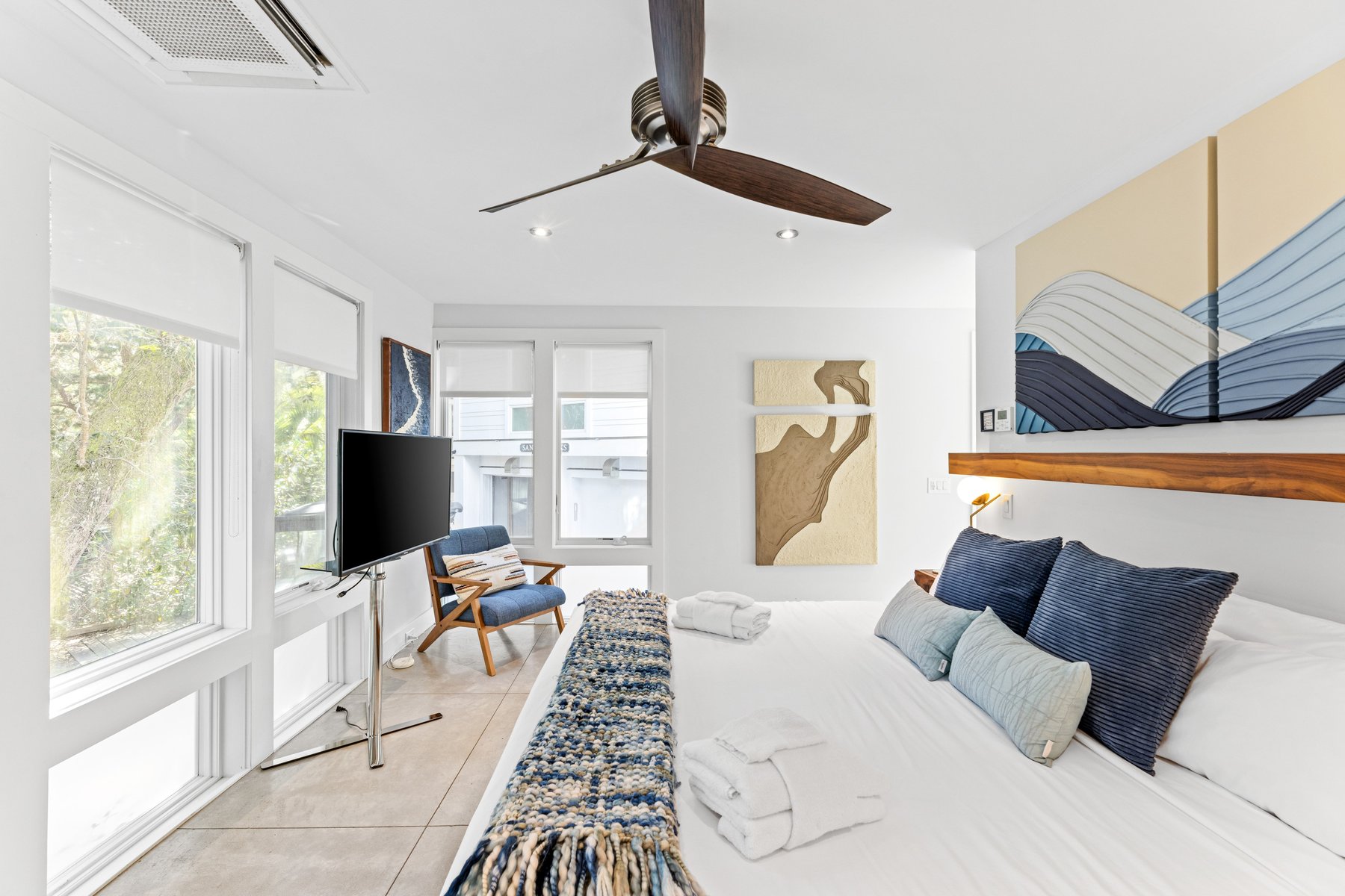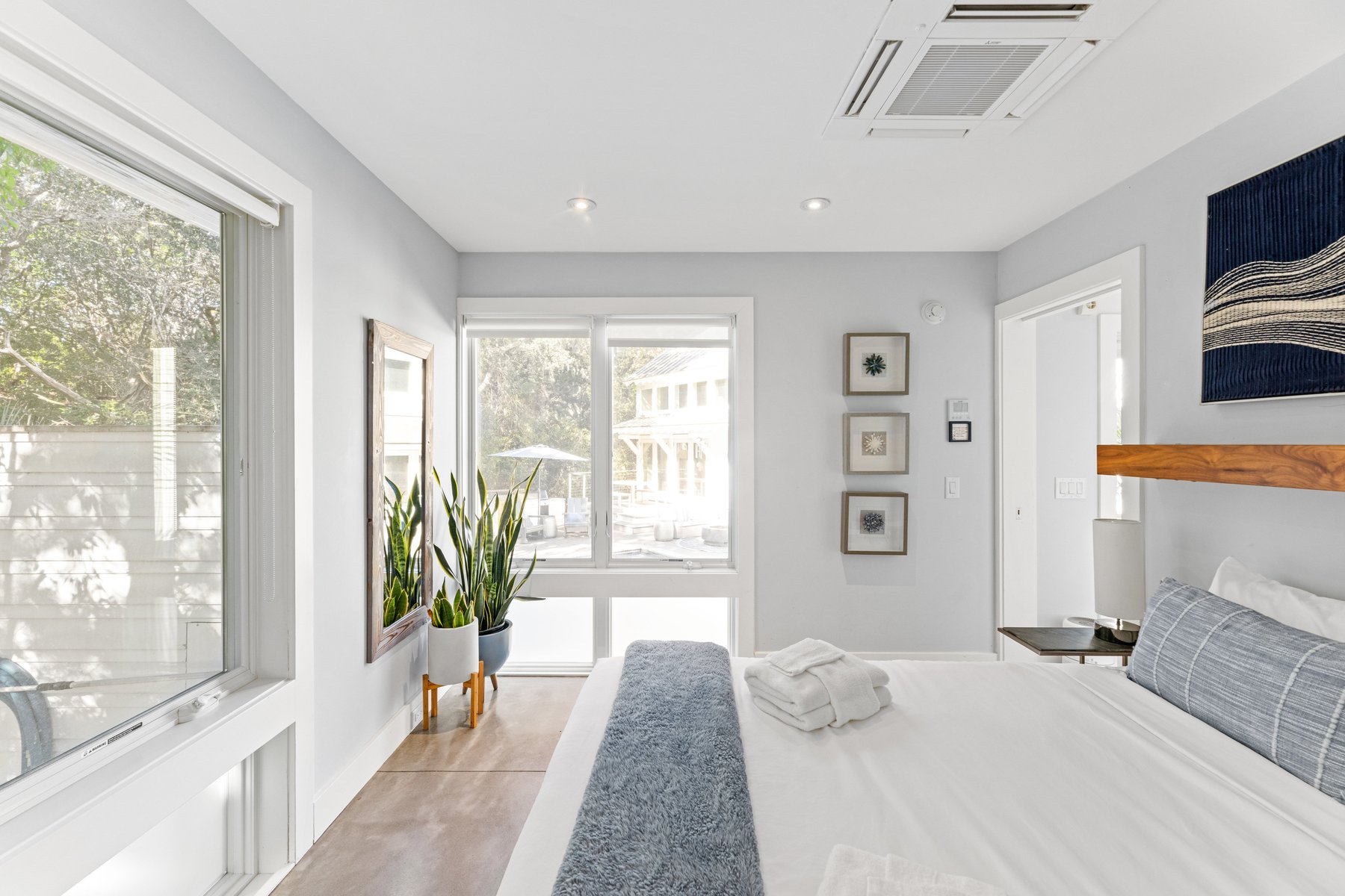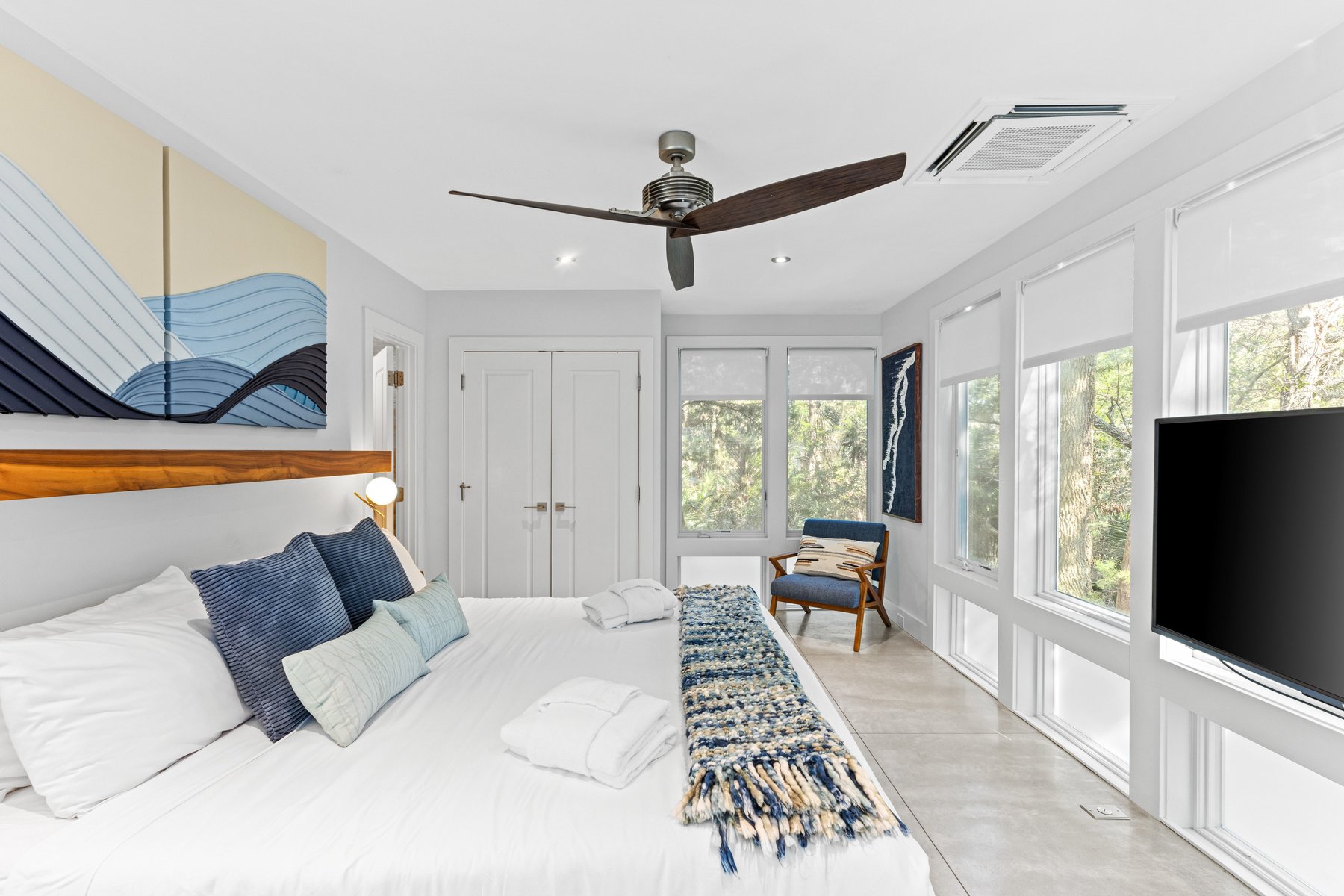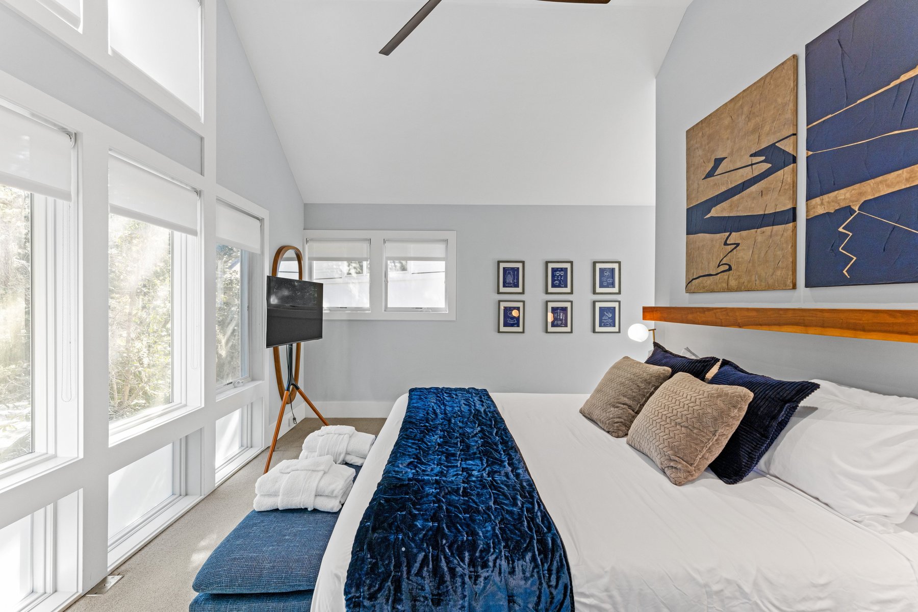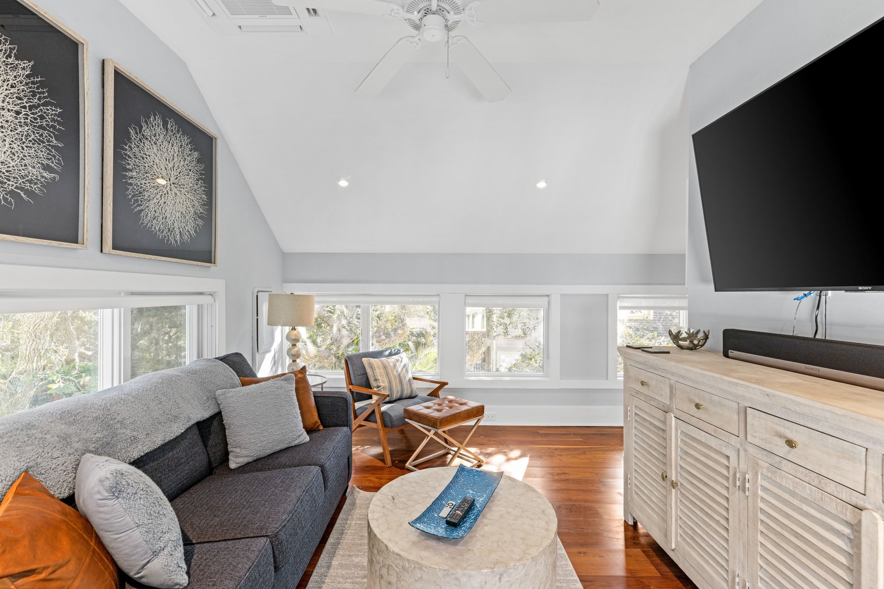 The upper floor of the main house provides an oversize sectional and offers plenty of seating for conversation, movie-watching, or game-playing, and large screen tv. If you must work from home while on vacation, we make it easier with ample desks and office space. Two private suites in the main house have king beds and indulgent spa like baths.