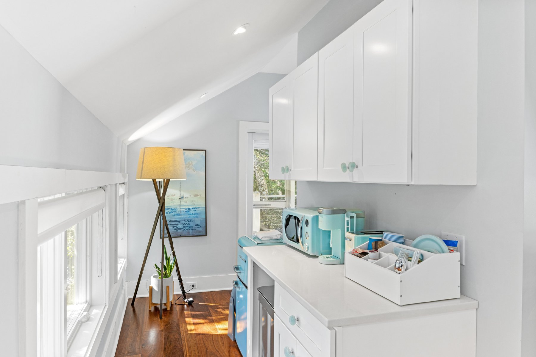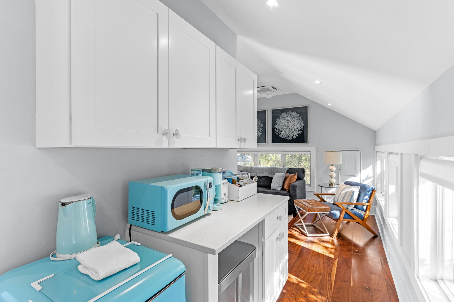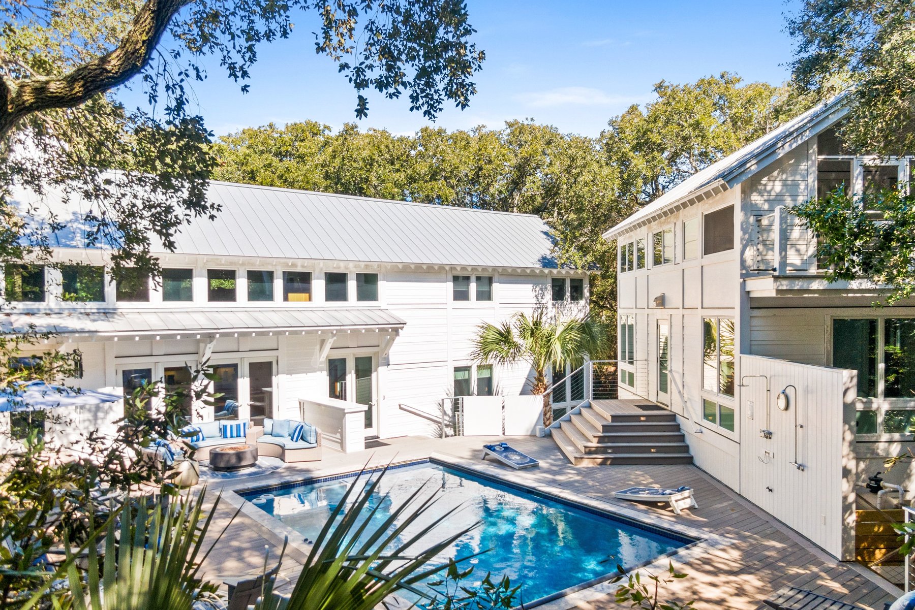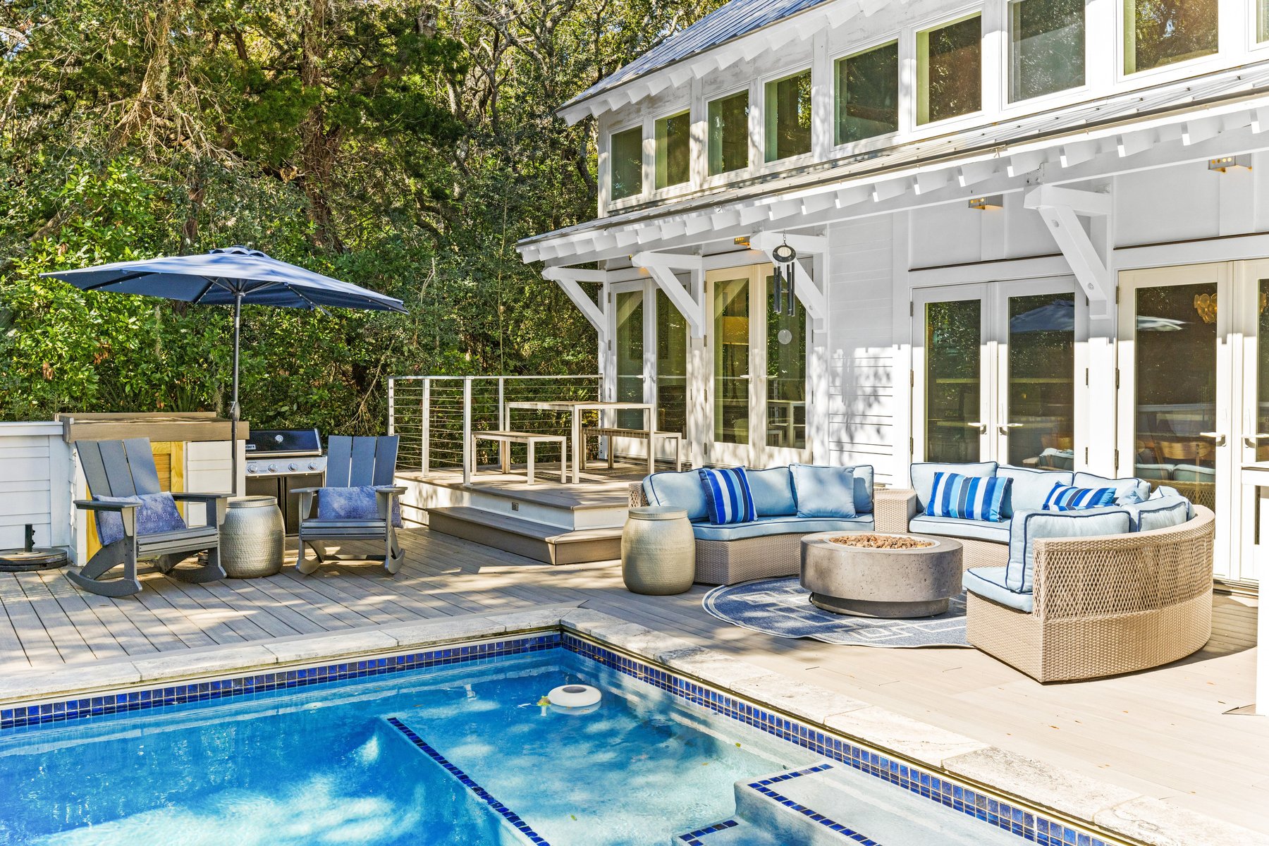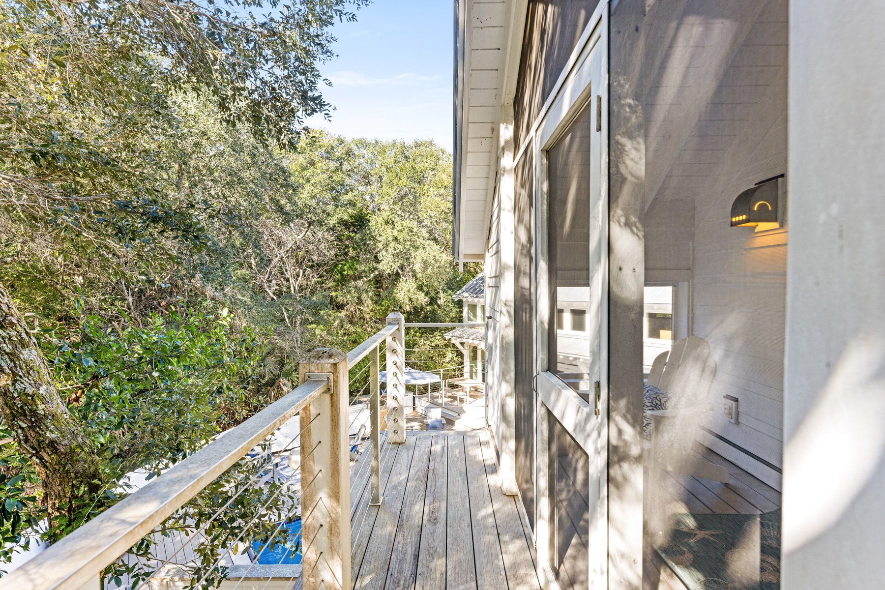 The guest house will keep your family members and guests very happy with two light-filled Queen bedroom suites also with pampering baths. Enjoy the private balcony with both a screen and open porch overlooking the treetops and live oaks. A sitting area/bedroom with new sleeper sofa all connect to a kitchenette for early morning coffee or late-night snacks. This guest house will become everyone's favorite place for privacy and quiet time while remaining connected to the pool and main house.
