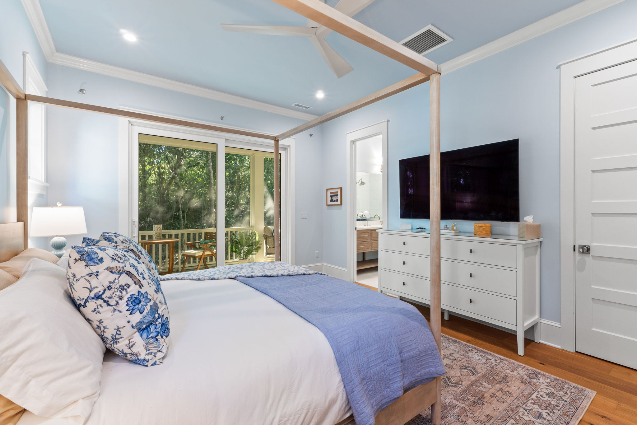 Walk across the deck to a separate crofter designed for those families needing some extra quiet space. This king suite also has an elegant step in shower and smart TV.